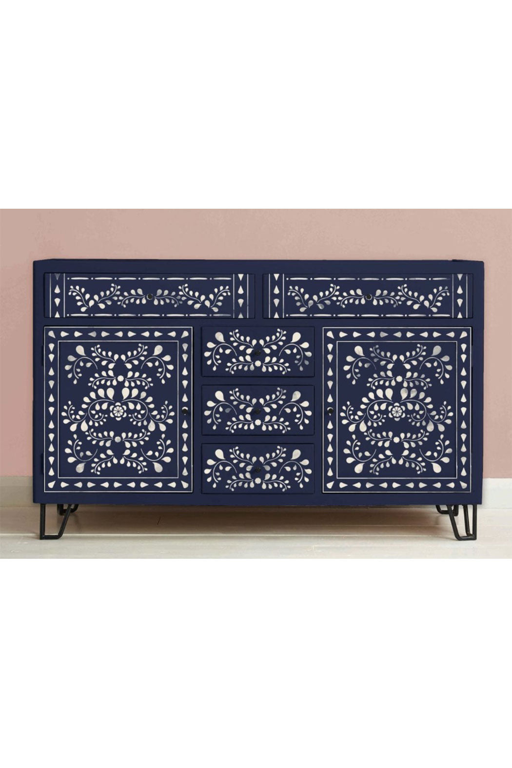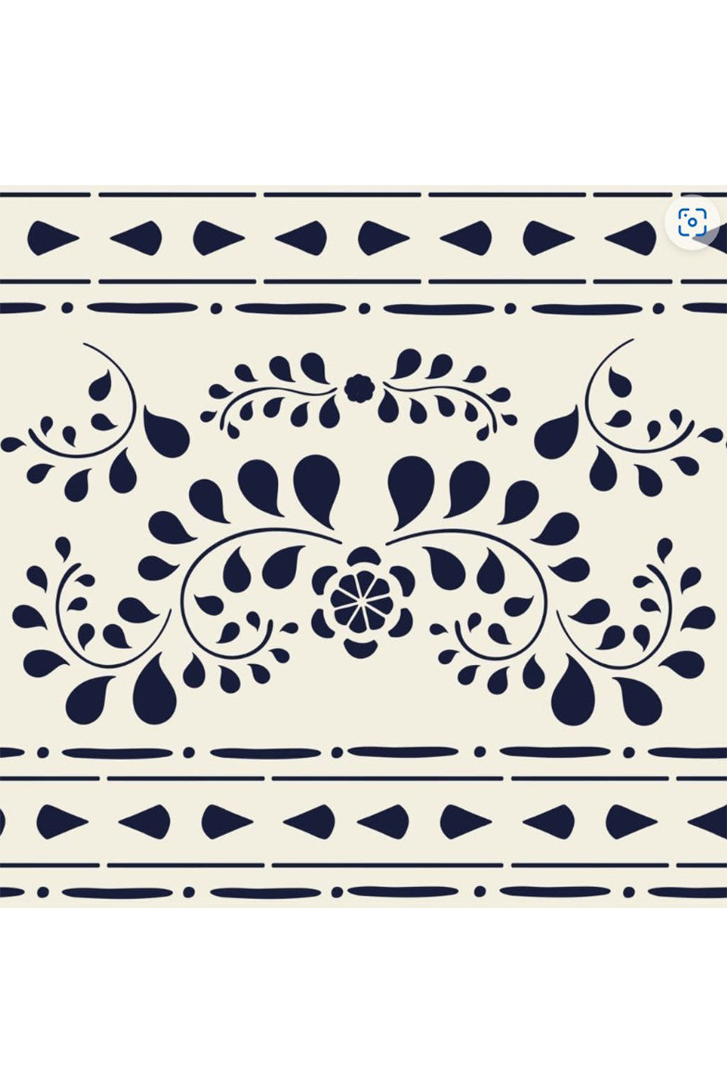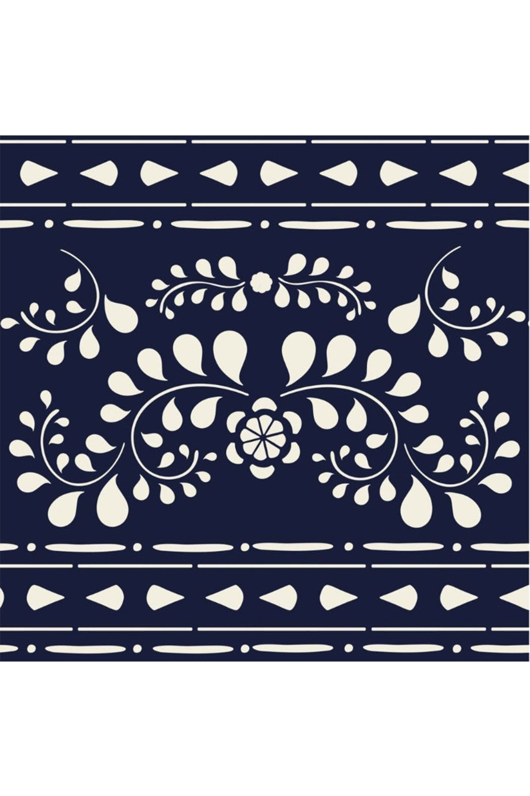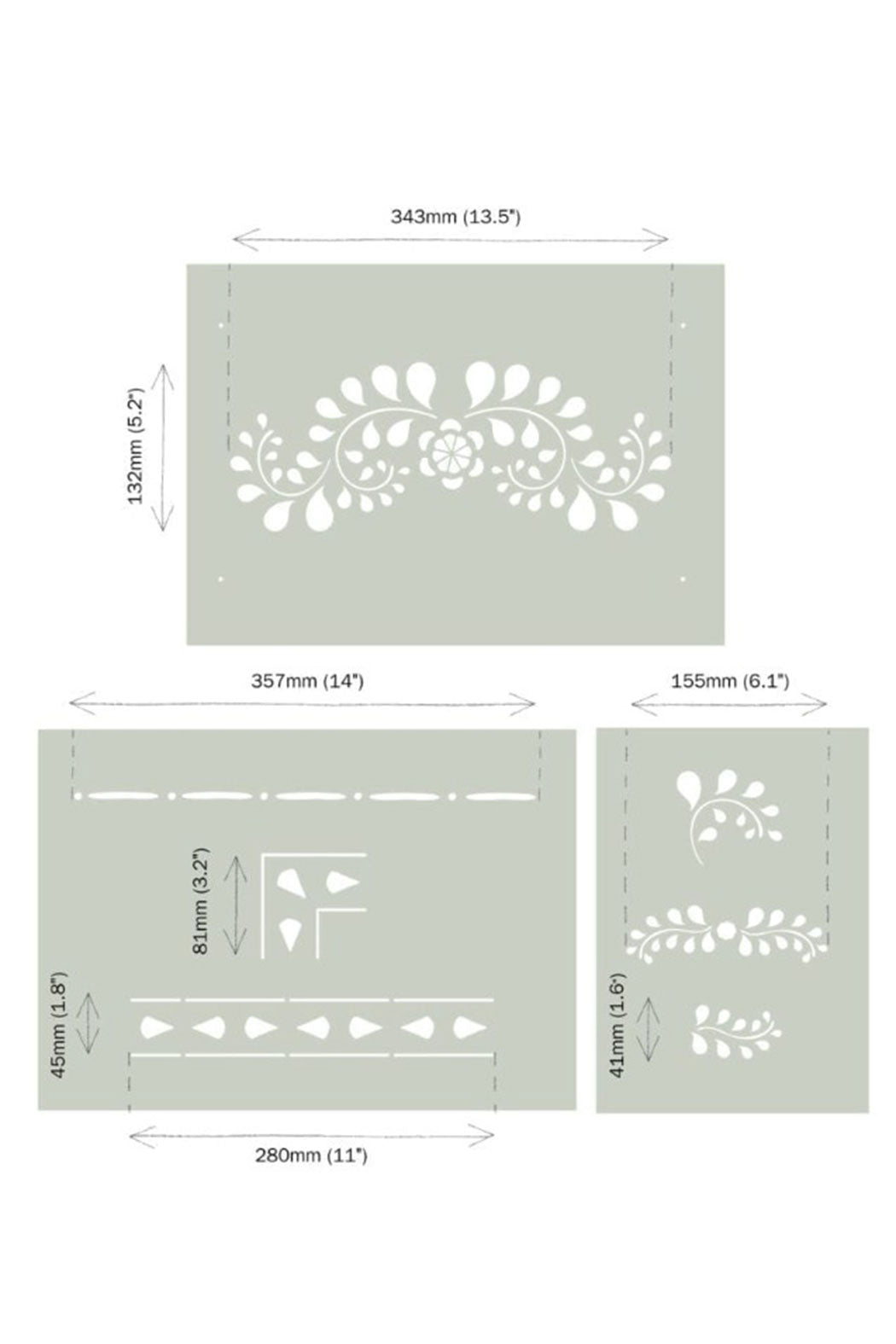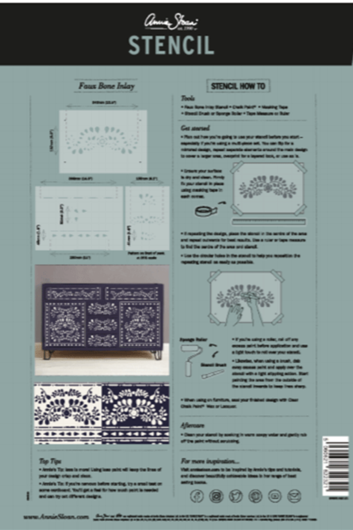 Paying homage to traditional Indian bone inlay furniture spotted on Annie’s adventures in Rajasthan, the Faux Bone Inlay stencil is made of three separate pieces, including the main inlay pattern and a selection of borders and corners, coming together with smaller embellishments to personalise your pattern.