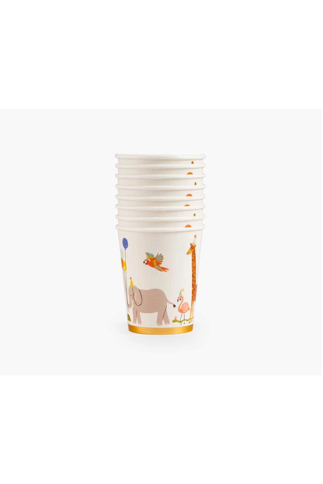 A parade of Party Animals march around our paper cups with balloons, presents, and gold foil accents for extra fun.