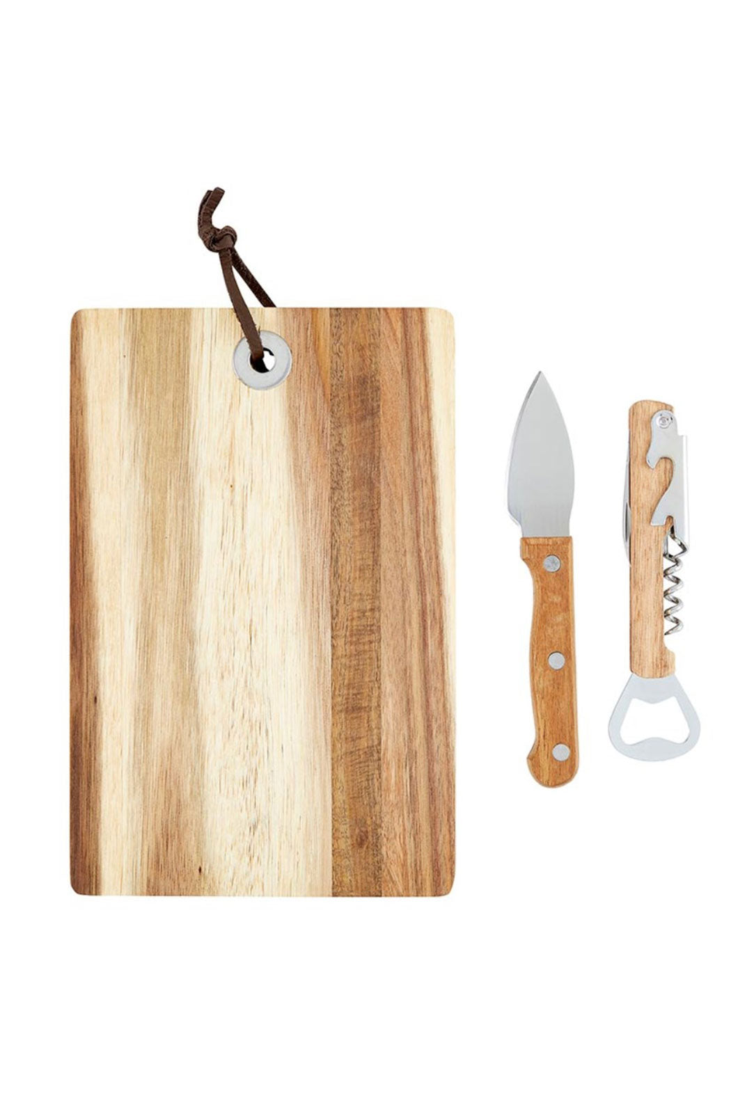 This acacia wood cheese board comes with cheese knife and corkscrew for a seamless outdoor dining experience. Perfect to display tasty snacks and open your favorite bottle of wine at your next outdoor gathering. Also makes a great gift for any occasion.
