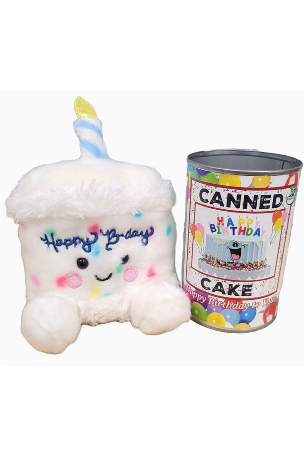 • Birthday cake plush sealed in a can. Use a can opener to open the fun gift or choose the pop top lid!