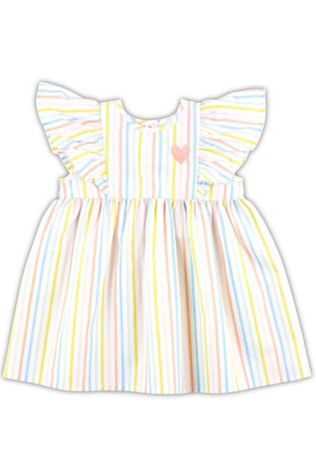 Chase away the rain with this sweet dress! This sweet denim dress features flutter sleeves, rainbow stripes and an embroidered heart on the chest.