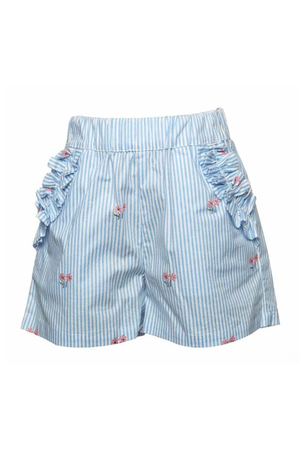 White & blue striped shorts with embroidered flowers. The shorts have an elastic waist and side pockets. The shorts pair perfectly with the matching tee.