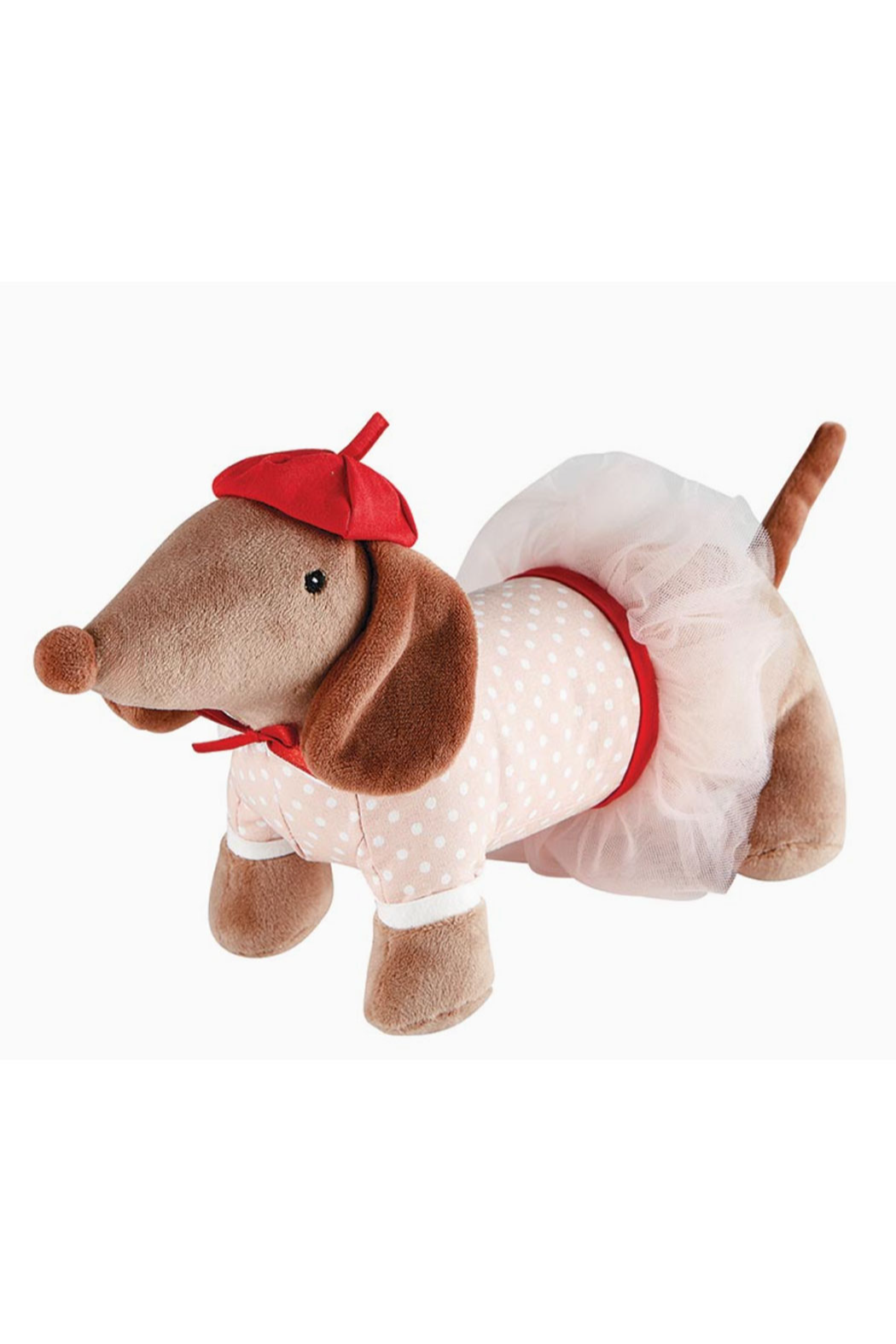 Meet Chloe, your baby's chic French companion! This stylish plush puppy exudes a French flair with cuddly soft materials, an adorable polka dot tutu dress and red beret. A delightful gift for dog lovers and children alike!