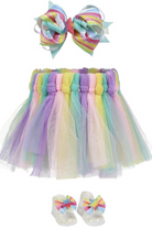 This adorable set contains a super soft tulle tutu, a headband with multicolor ribbons and curly ribbon accents, plus ribbon sandals. Each tutu set includes a tutu, matching elastic headband, and coordinating ribbon sandals. Ribbon sandals can be worn over socks to keep baby's socks in place or on bare feet to showcase those adorable little toes! Size 0-12 months.