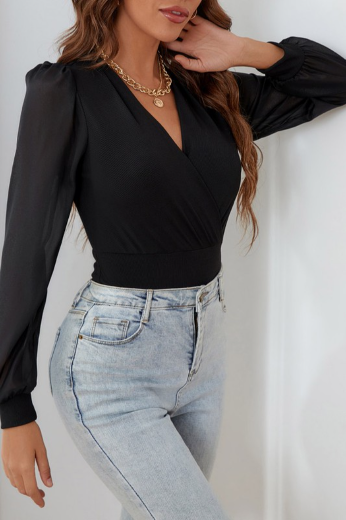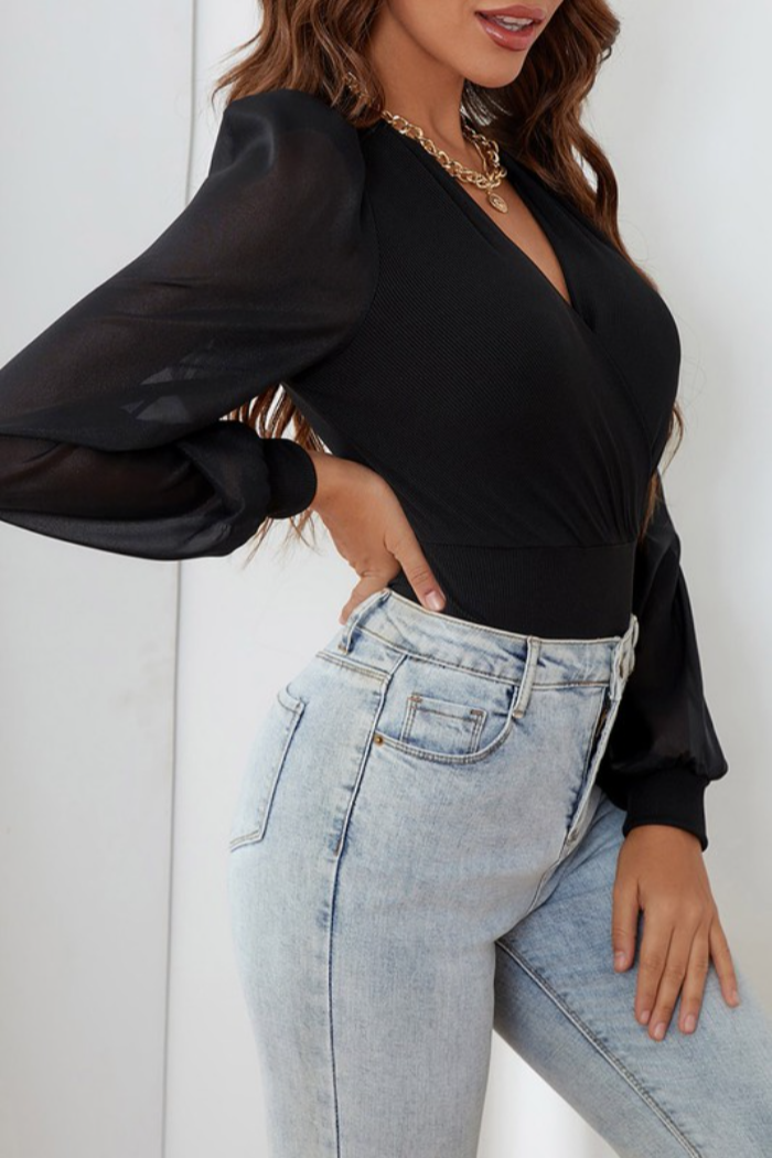 The V-neck cut of this bodysuit enhances your neckline. The mesh sleeves give it a unique and edgy look and add a playful and feminine touch.