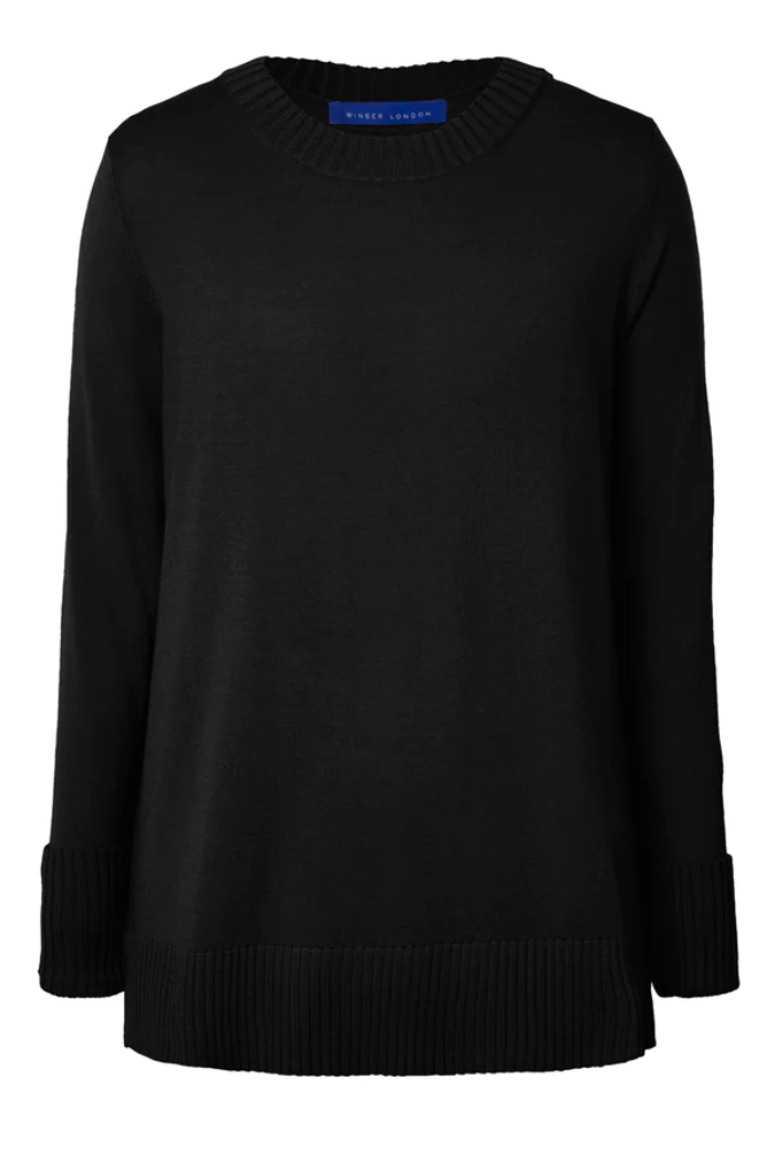 Pure fine merino wool crew neck with a flattering deep rib hem with side vent detail and long rib cuffs which can be turned back to suit your arm length or style.