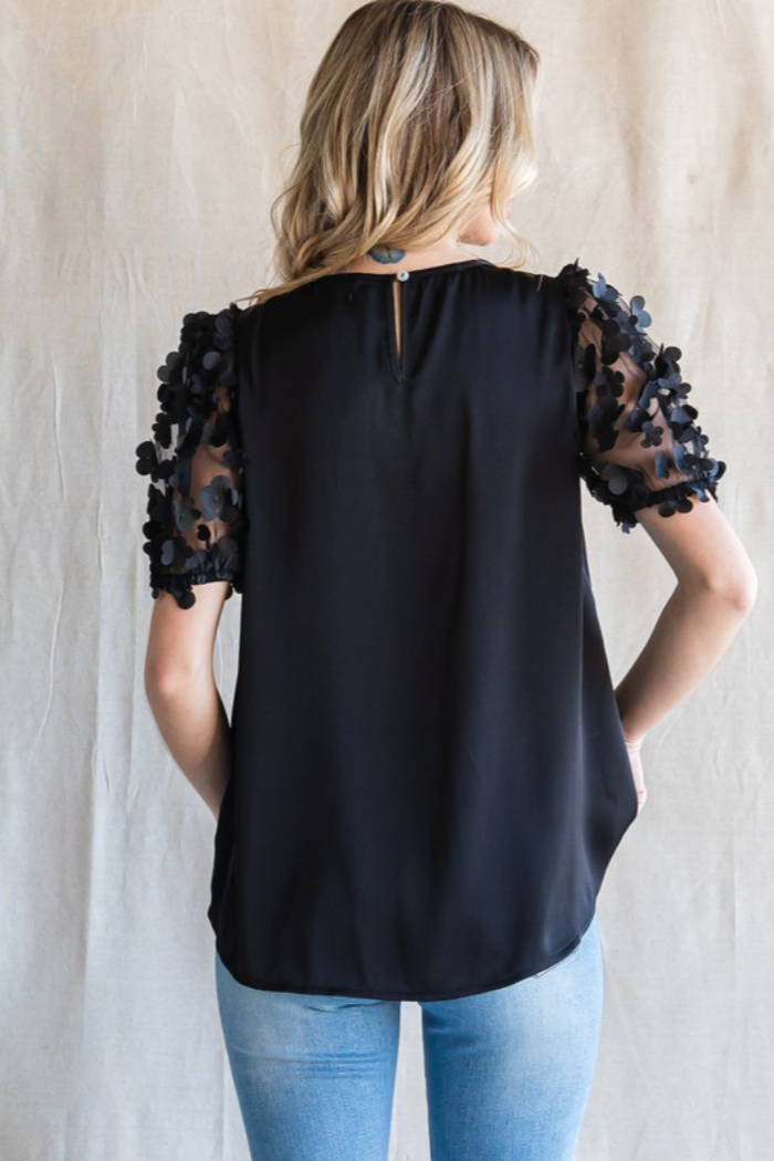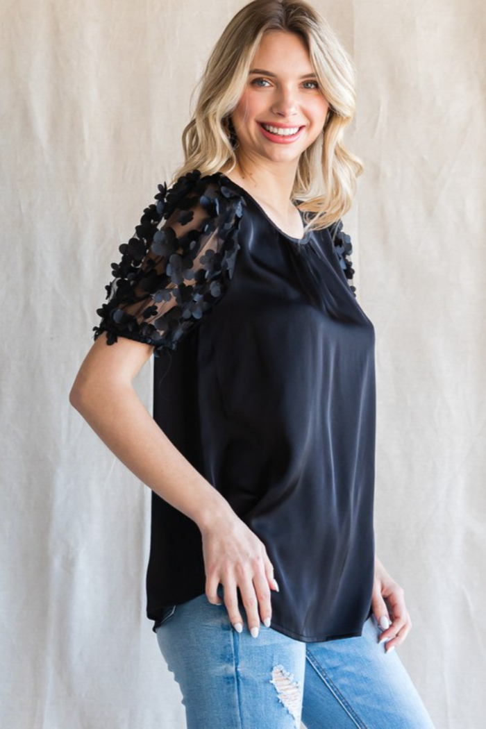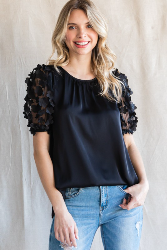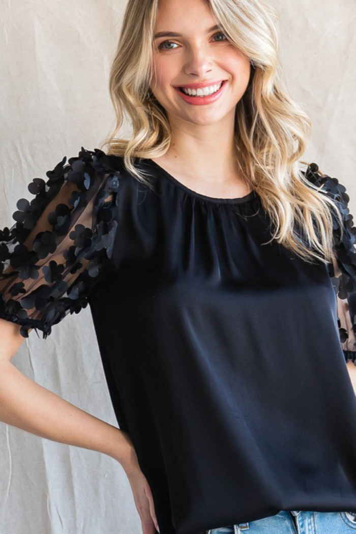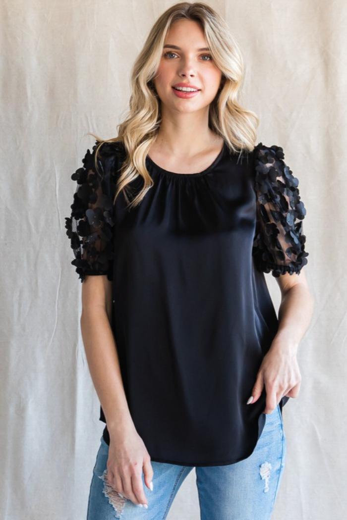 Satin top with a U-neck, back key hole, and textured flower mesh bubble sleeves.