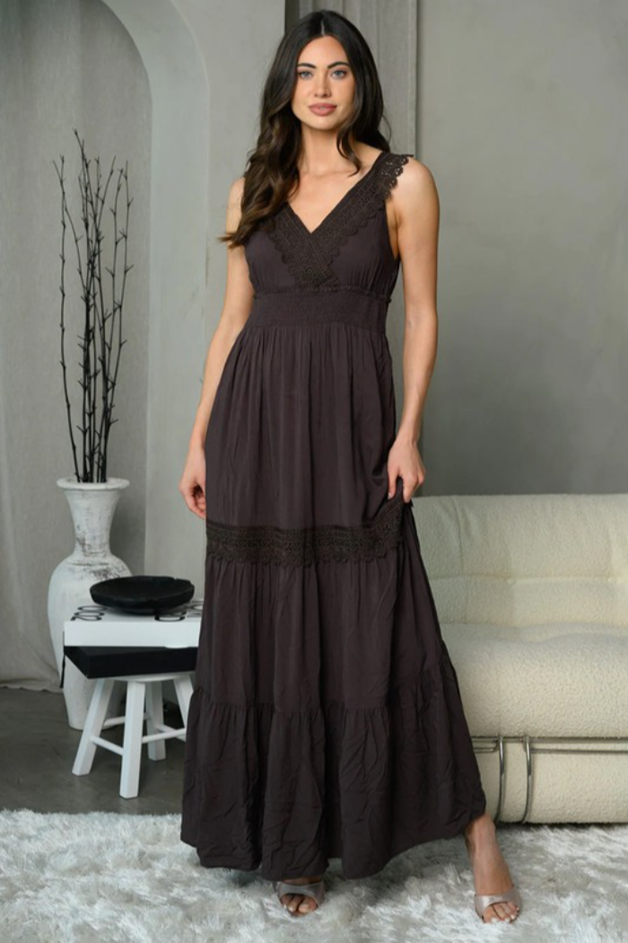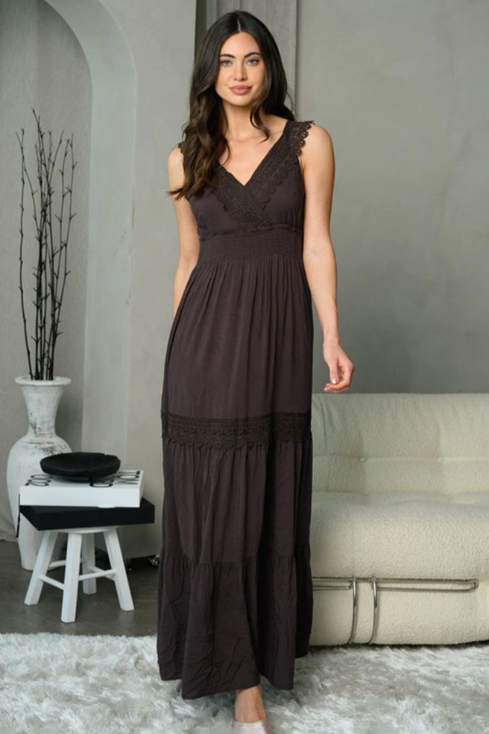 Solid crochet contrasted sleeveless v-neck tiered maxi dress.