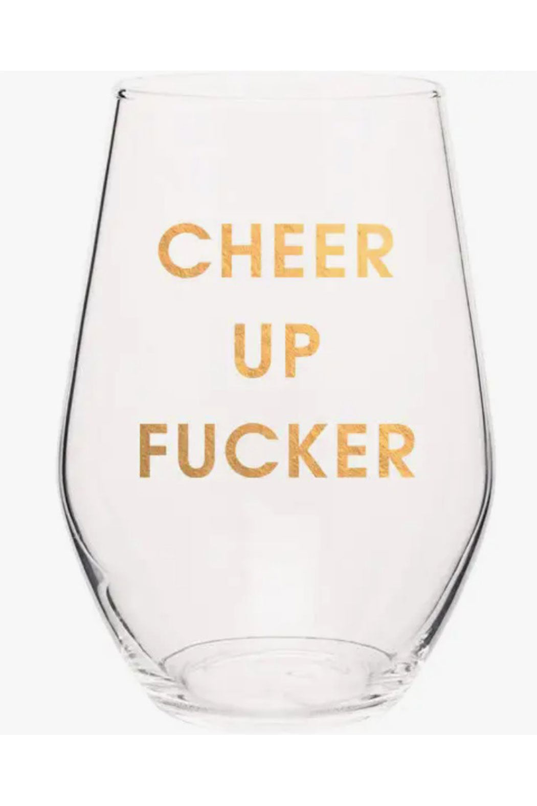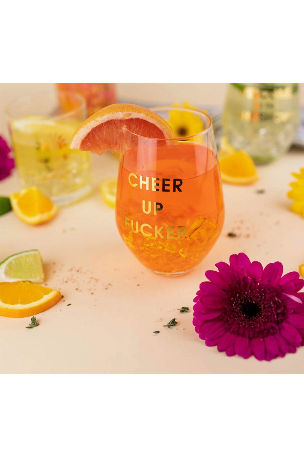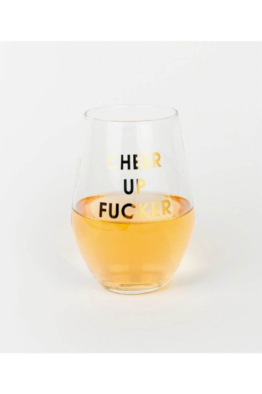 Crush your wine in style with our "cheer up fucker" gold foil 19oz stemless wine glass.