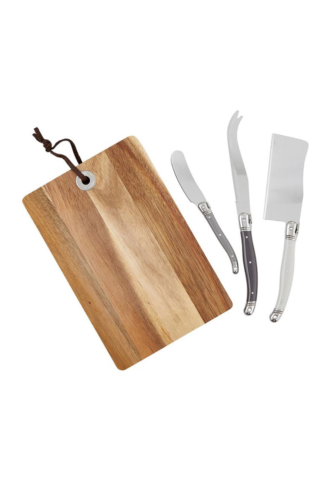 This acacia wood cheese board comes with three assorted cheese knives including, a cleaver knife, a soft cheese knife, and a spreader. Perfect to display your favorite snacks at any gathering.