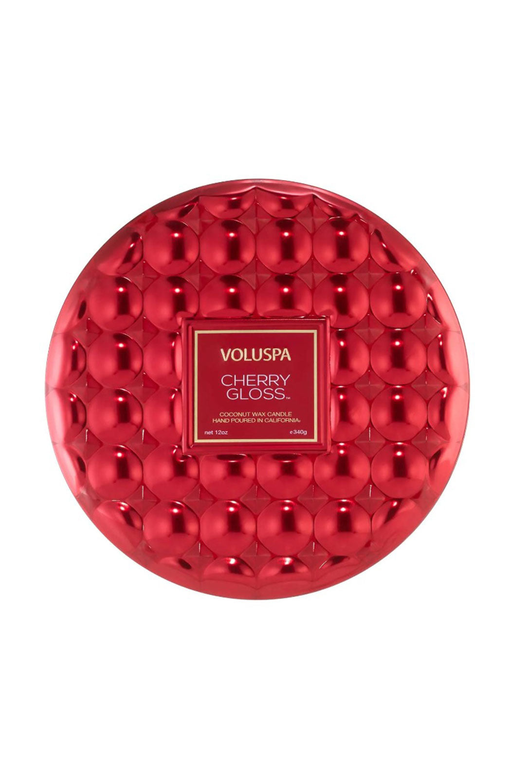 Three wicks for a generous wax pool, sculpted bold red pattern wrapped top to bottom with an embossed lid.