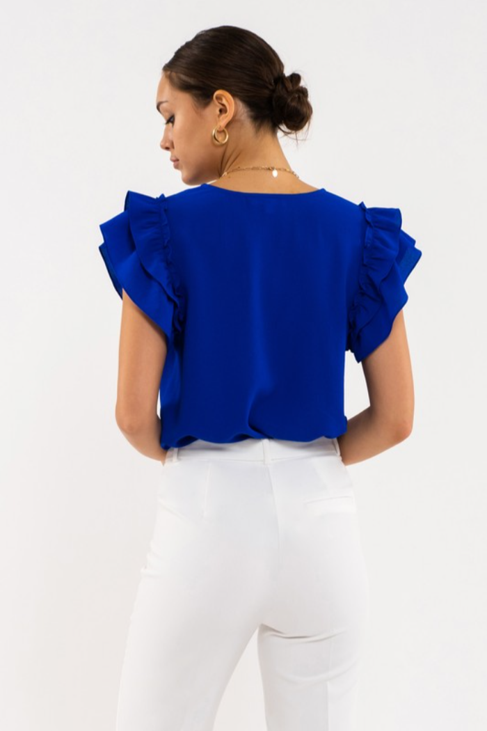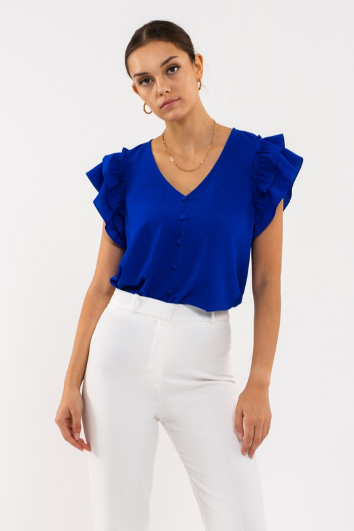 V-neck layered ruffle cap sleeve blouse with front non-functional buttons.