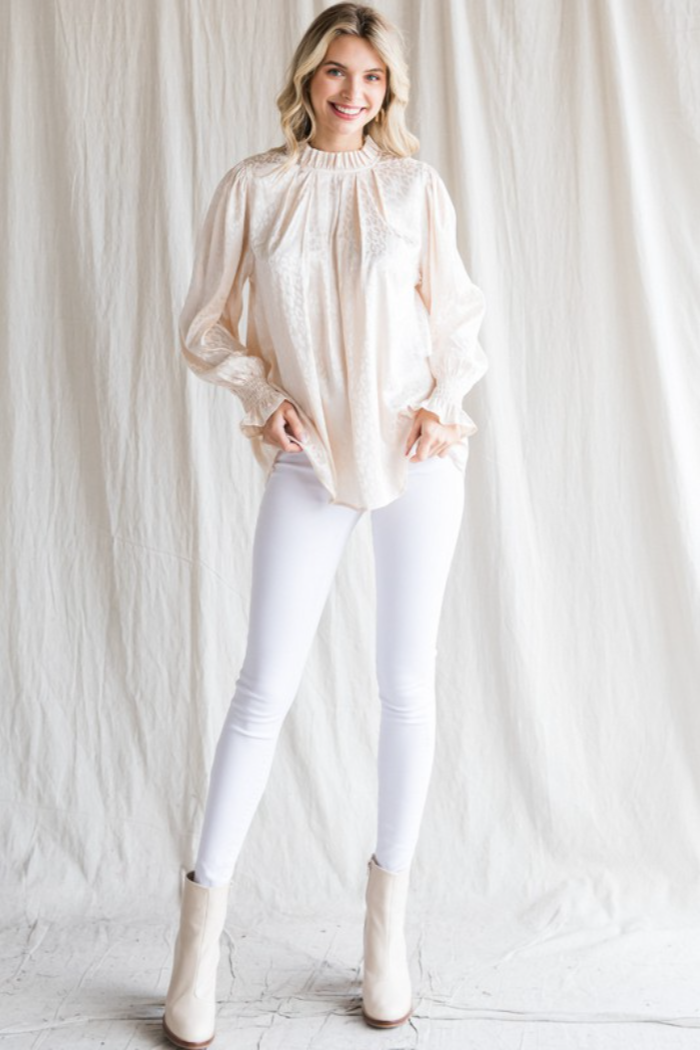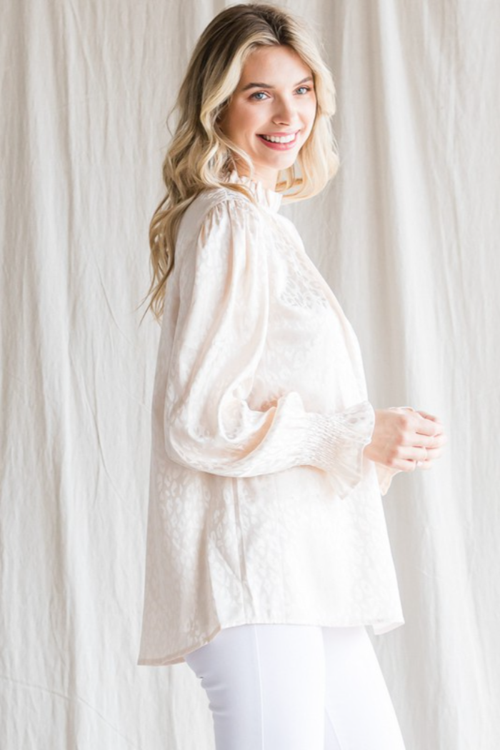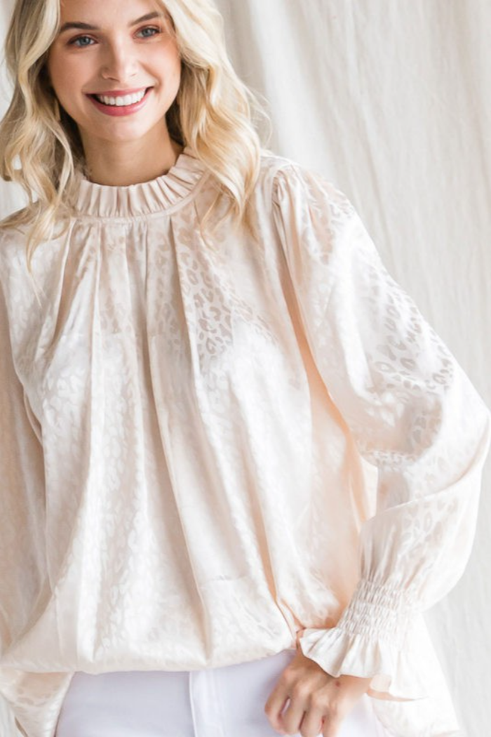 Leopard print top with a frill mock neckline and long sleeves with smocked cuffs.