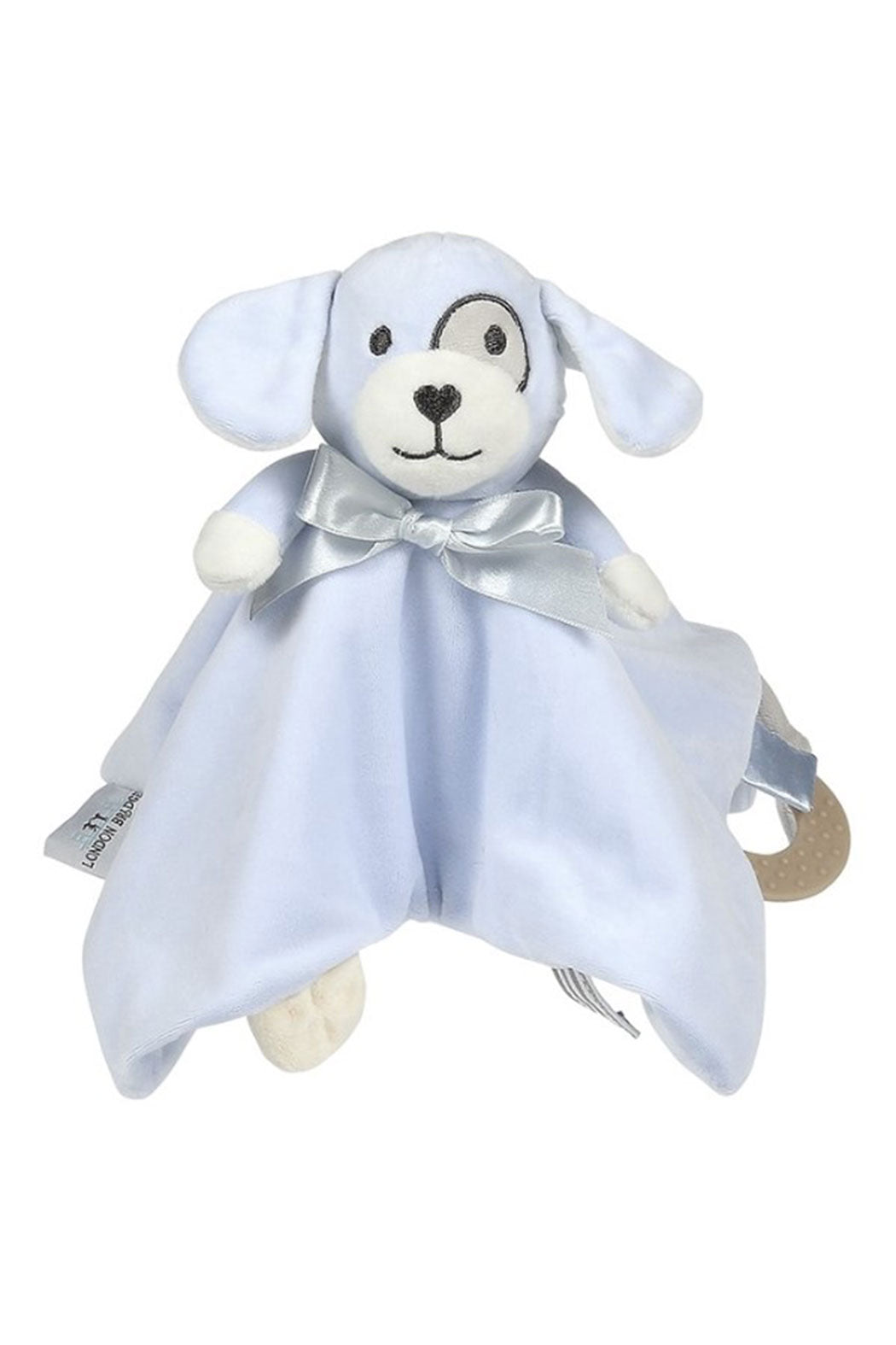 This loveable plush puppy dog head in the center with a rattle inside. It has a teething ring attached as well as multiple tabs that are great for baby's sensory exploration - some tabs crinkle, some are loops, and some have knots.