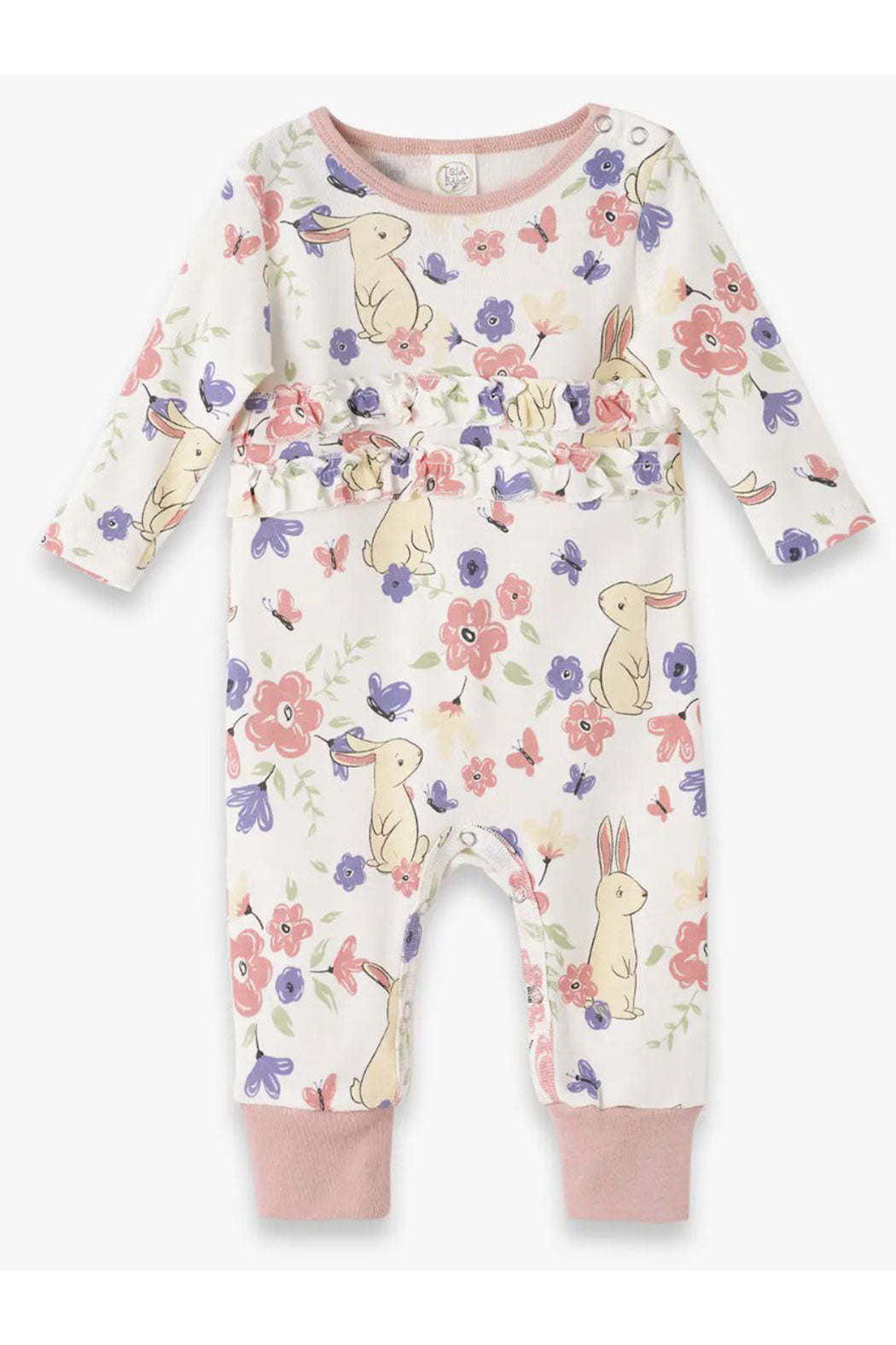 Baby girl Easter Garden romper with front bodice ruffles. Soft and stretchy 100% cotton rib material is oh-so-gentle against baby's skin. Romper snaps at shoulder & underneath for changing ease.