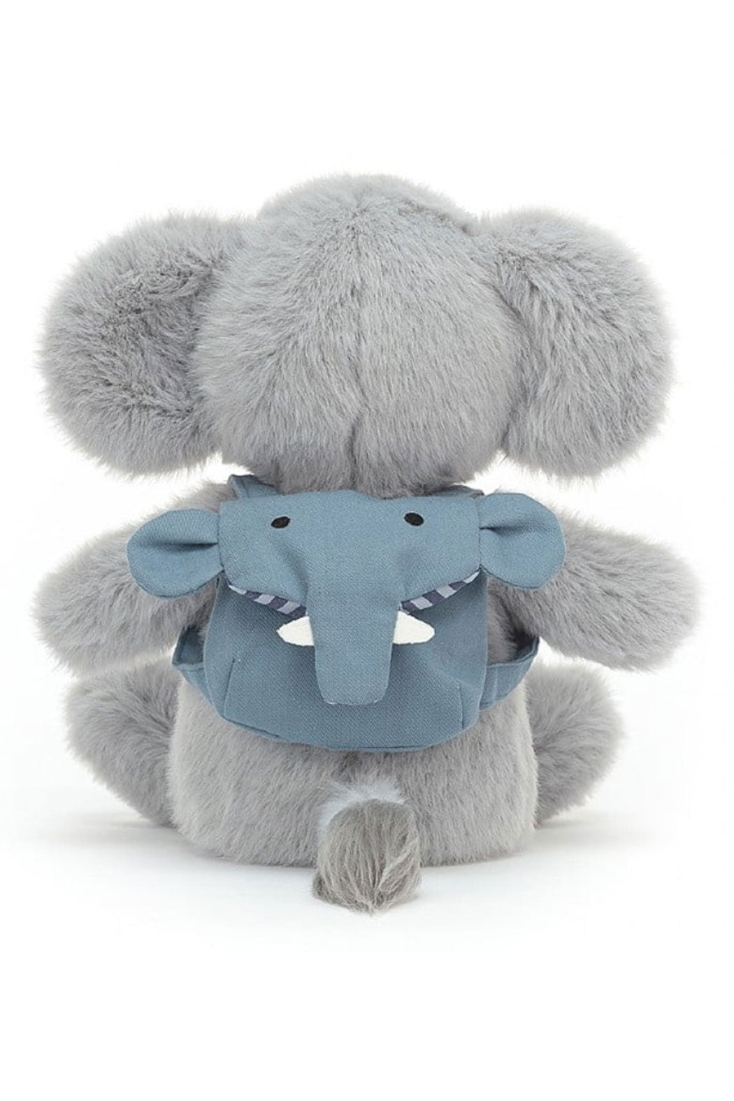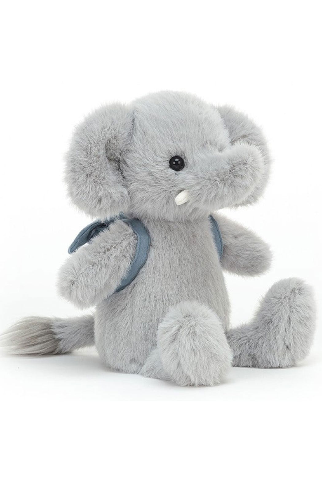 Backpack Elephant's ready for the hike! This tusky, fuzzy grey pack-yderm hasn't forgotten a single item, but needs to get a move on! With tufty tail, blue linen backpack and trunk raised quizzically, you can stomp out in style with this softy by your side!