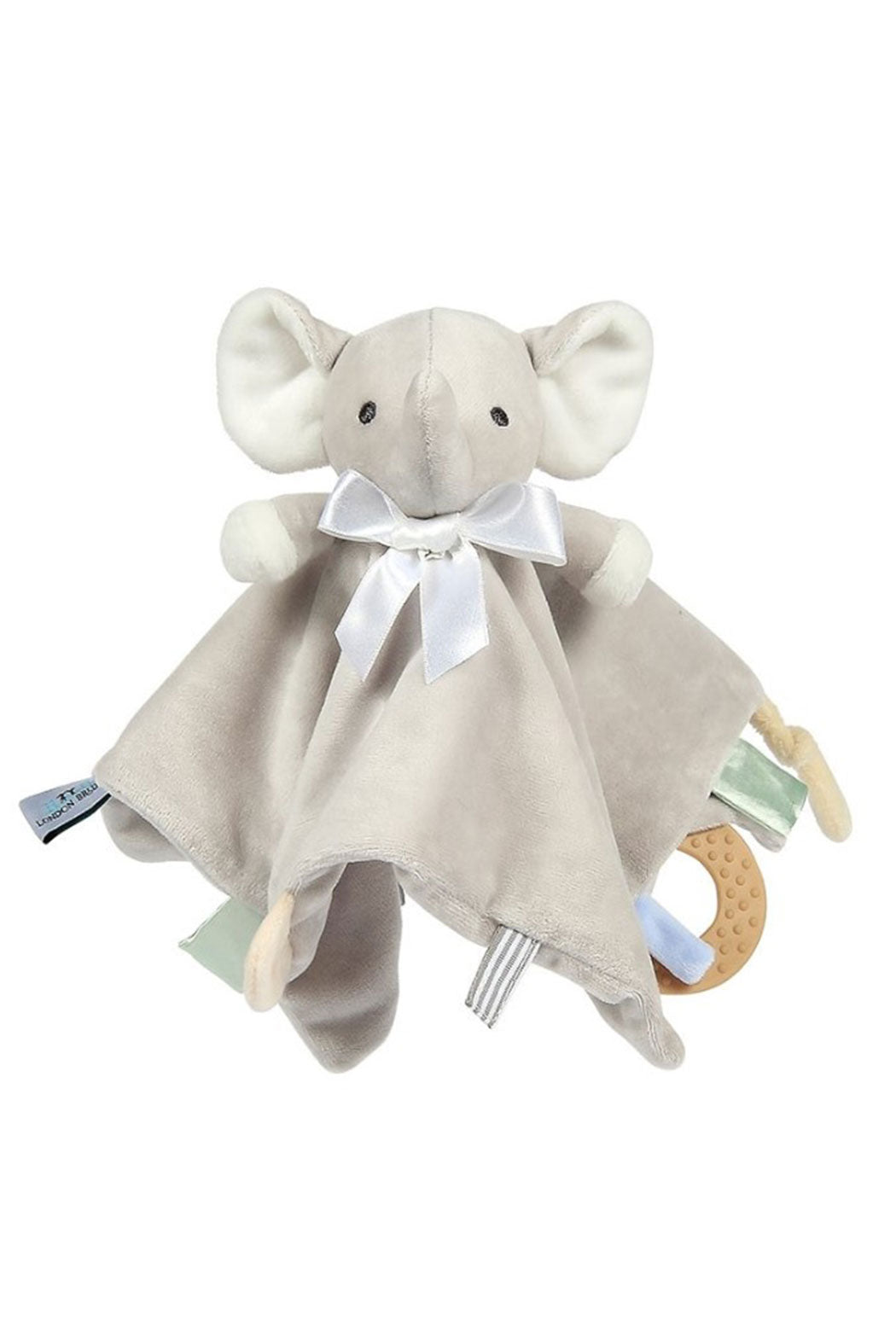 This loveable plush elephant head in the center with a rattle inside. It has a teething ring attached as well as multiple tabs that are great for baby's sensory exploration - some tabs crinkle, some are loops, and some have knots.