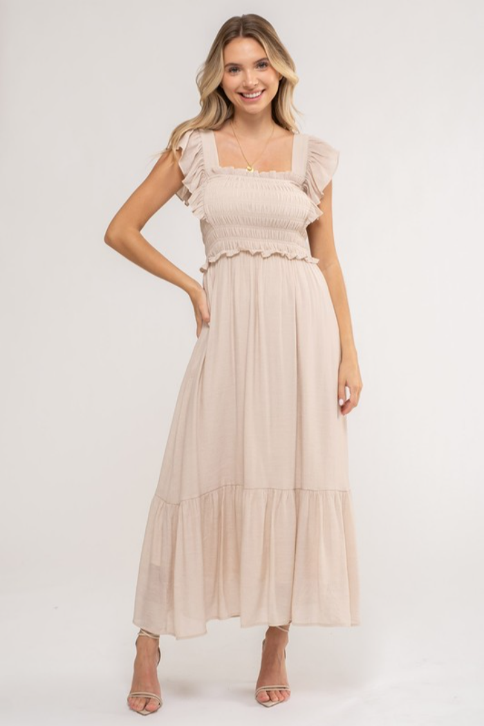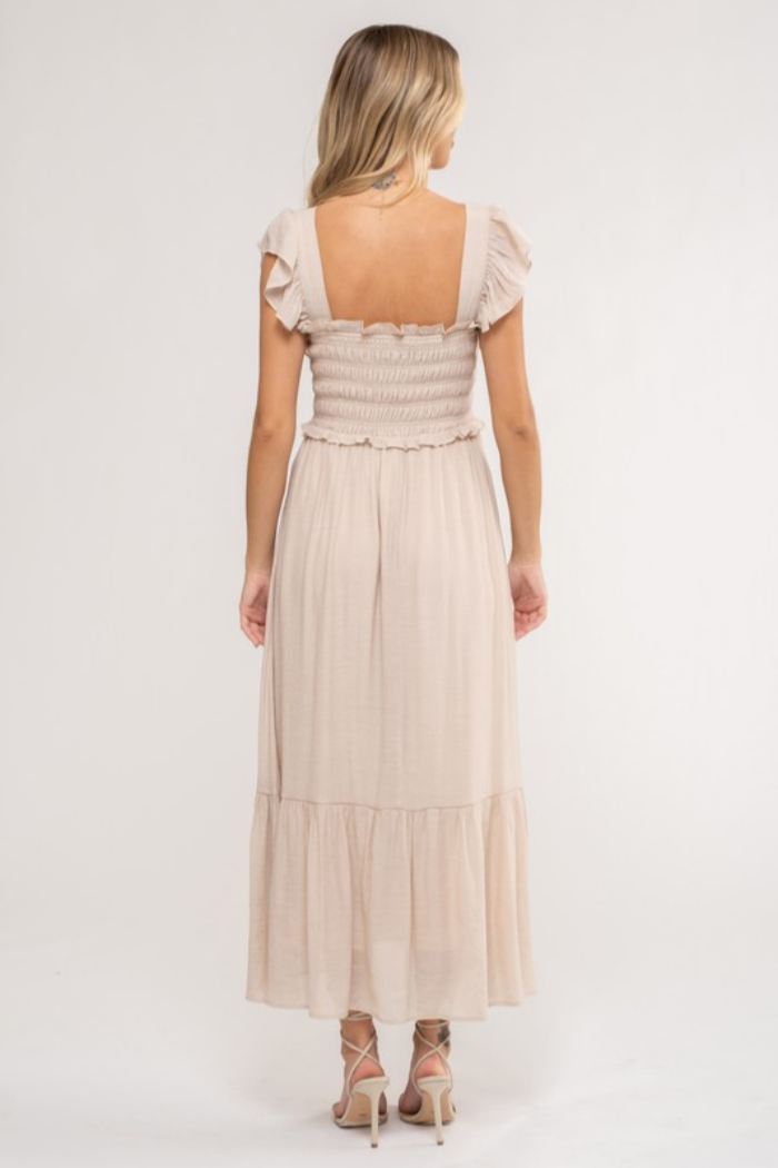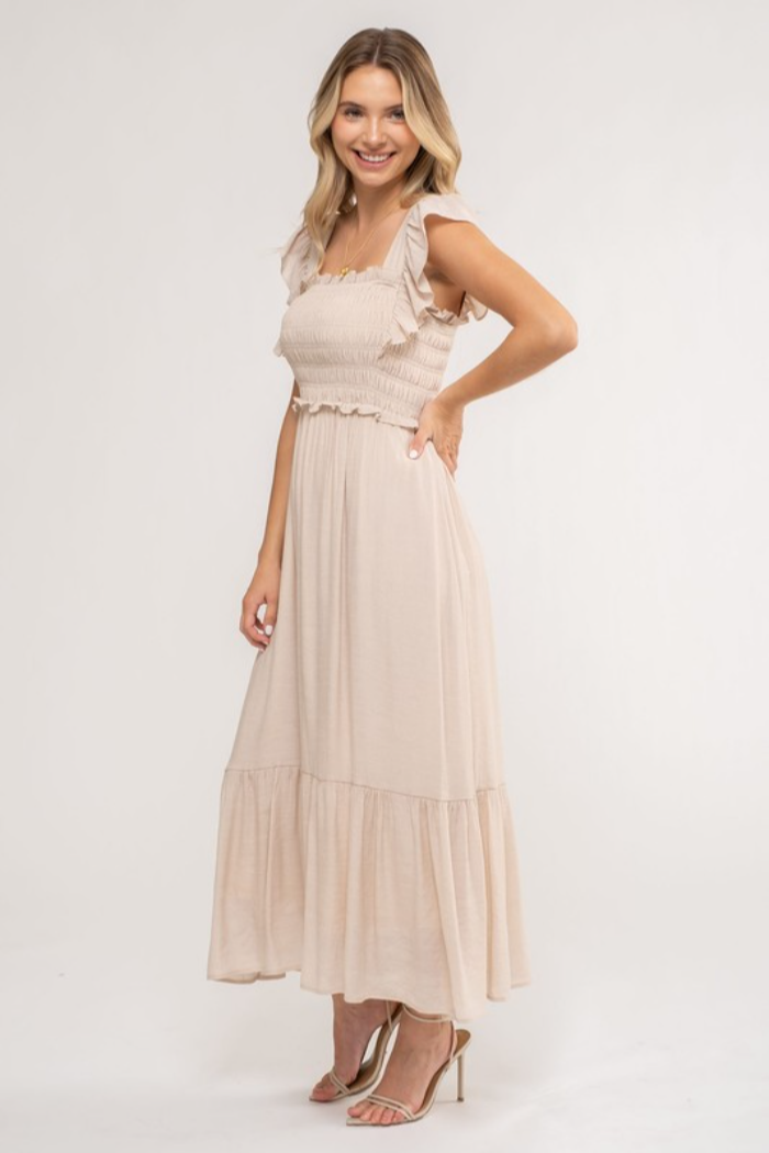 Lined ruffle sleeve dress with square neckline.