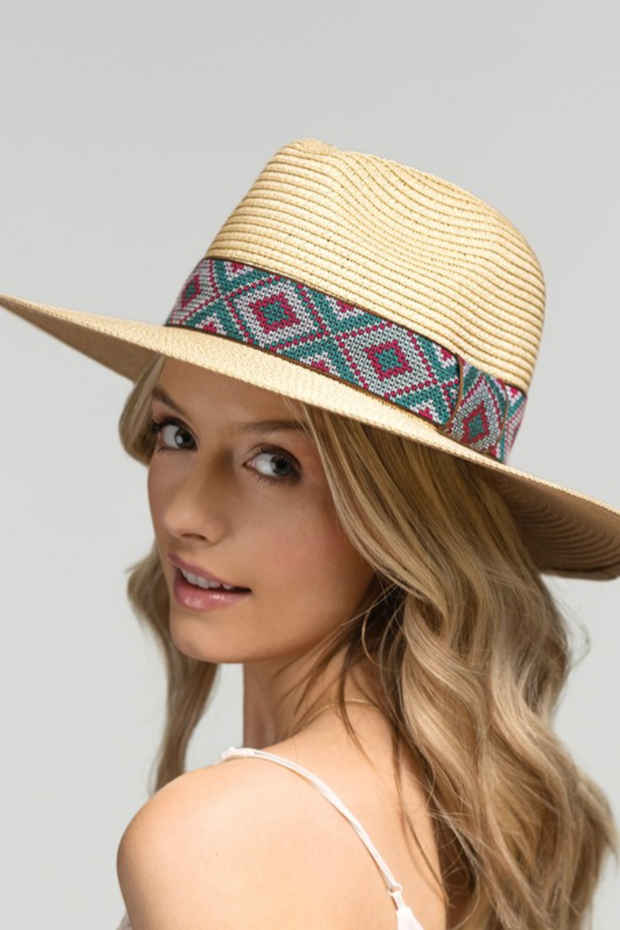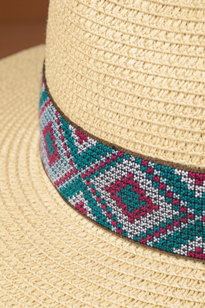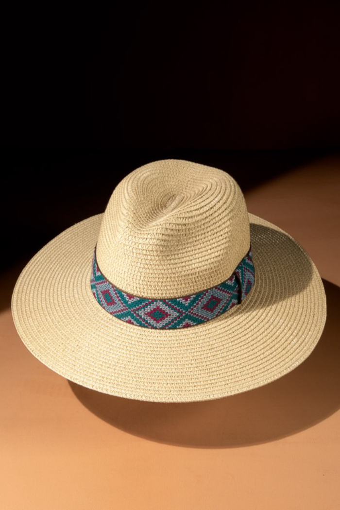 Boho panama hat with a colorful ethnic print band and an inner adjustable band