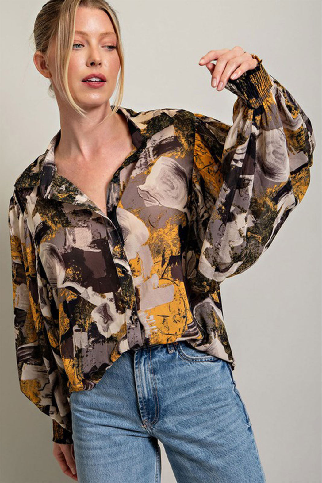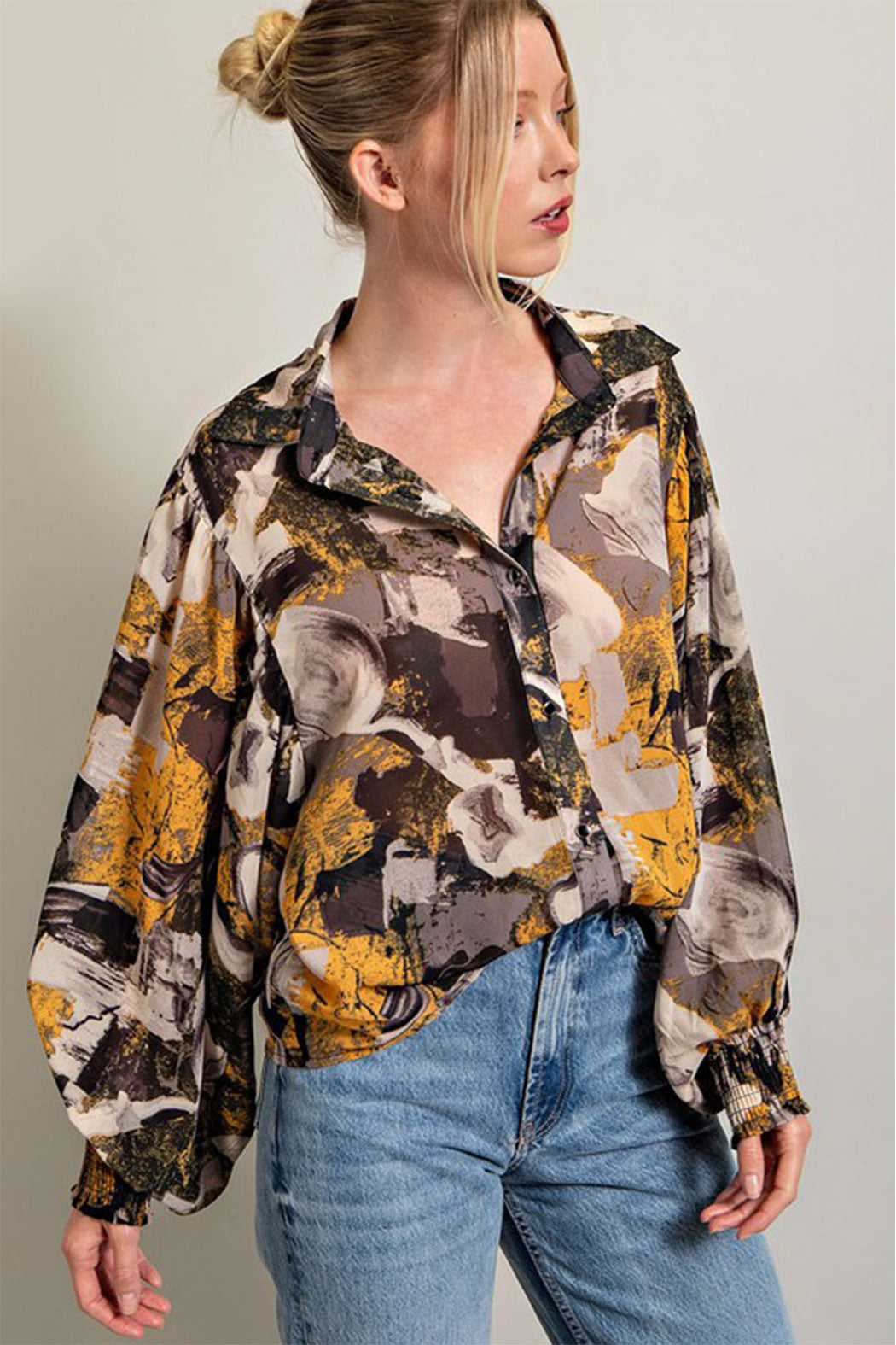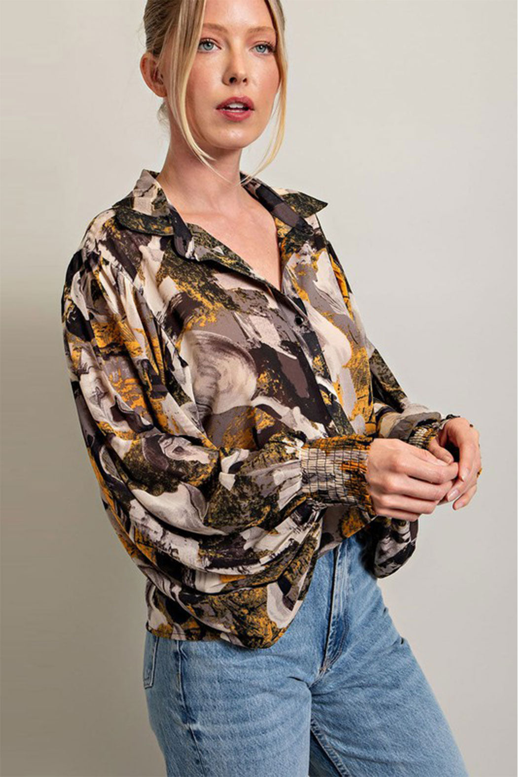 Printed button down shirt top featuring smocked cuffs for a bubble sleeve effect, a collared neckline and pinching for added detail.