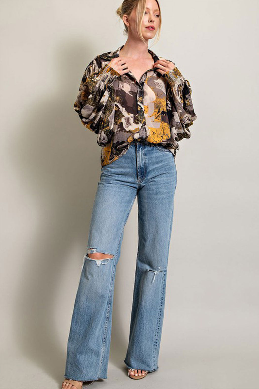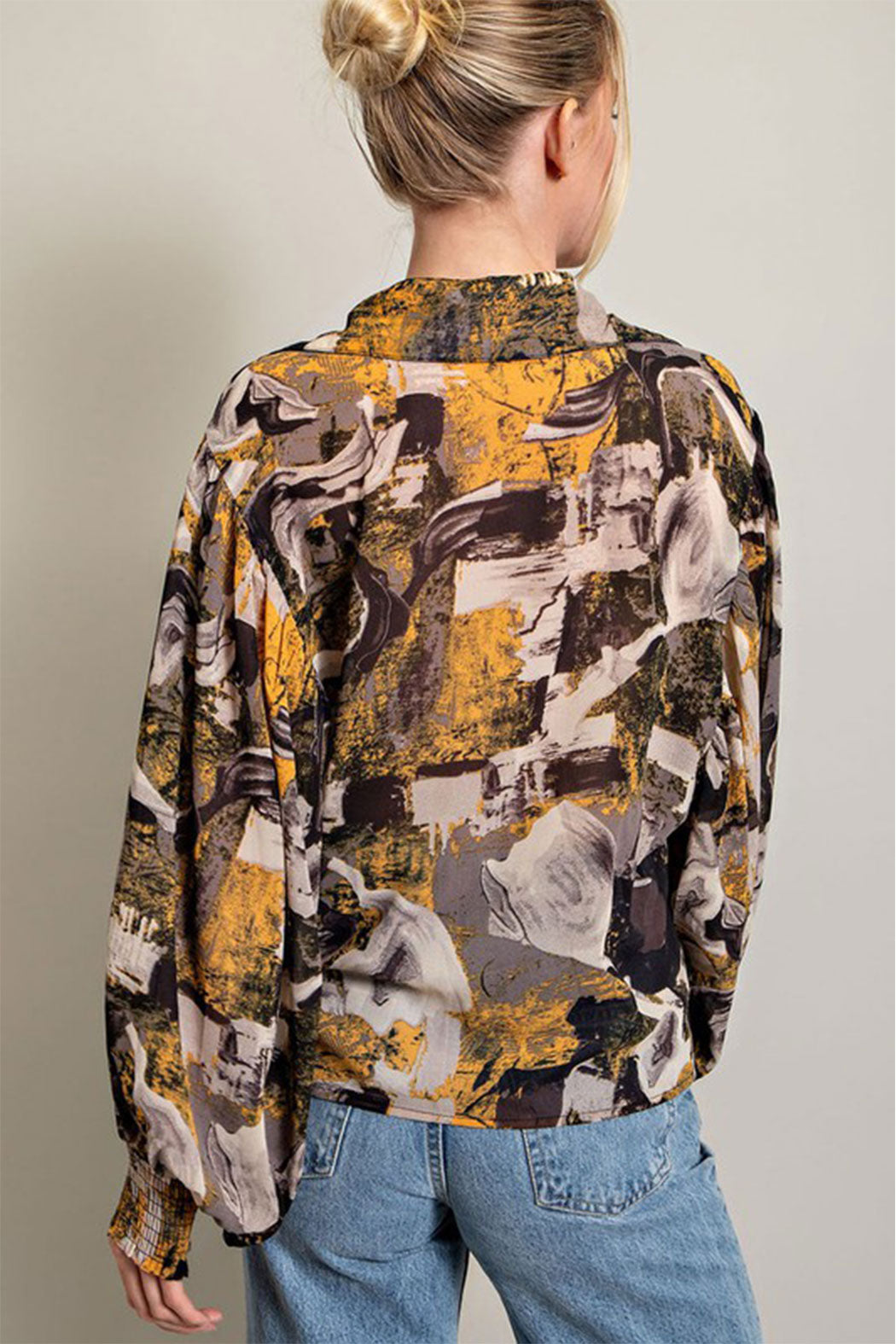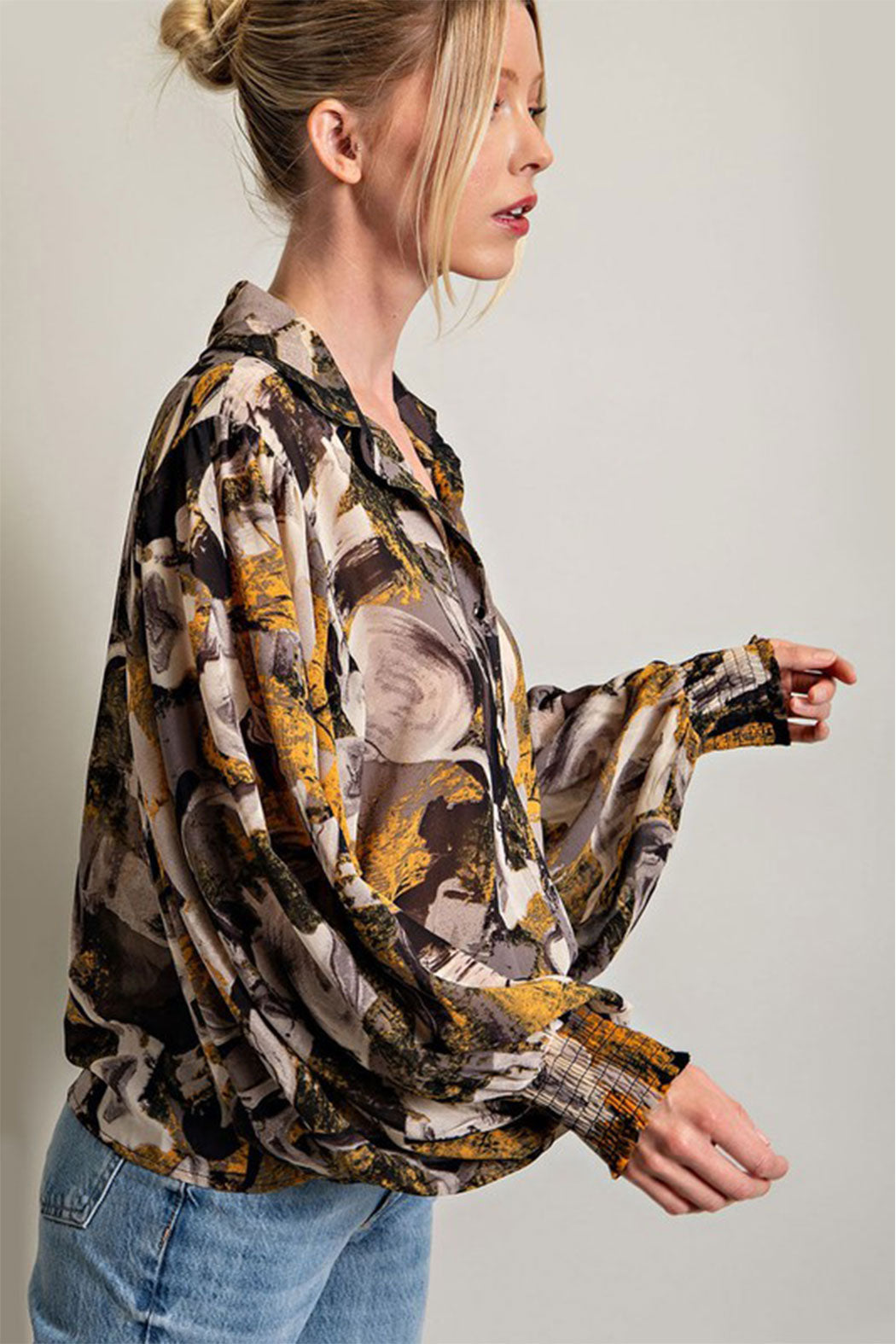 Printed button down shirt top featuring smocked cuffs for a bubble sleeve effect, a collared neckline and pinching for added detail.