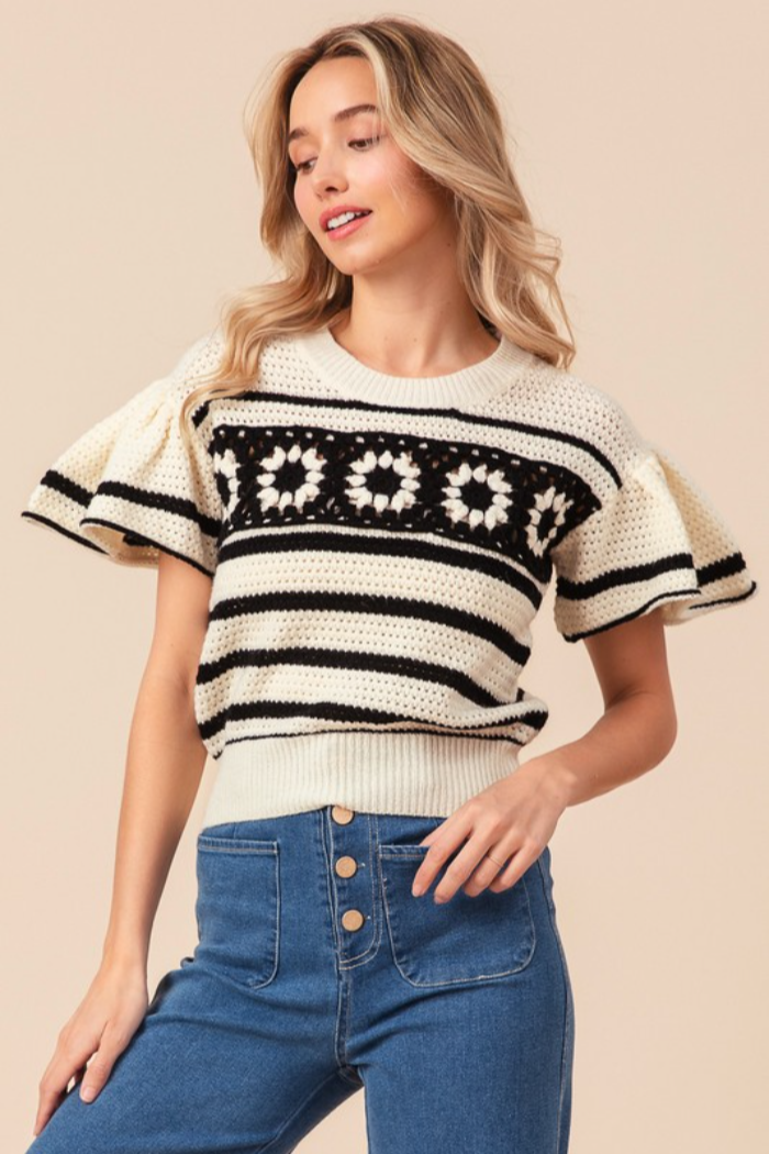 Crochet square front stripe flutter sleeve sweater top.