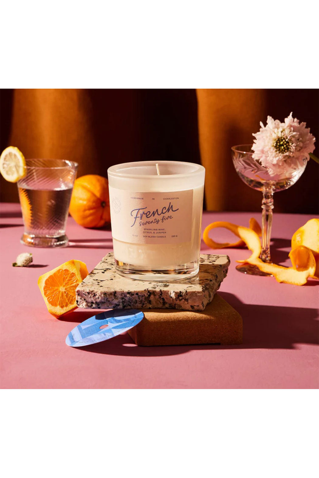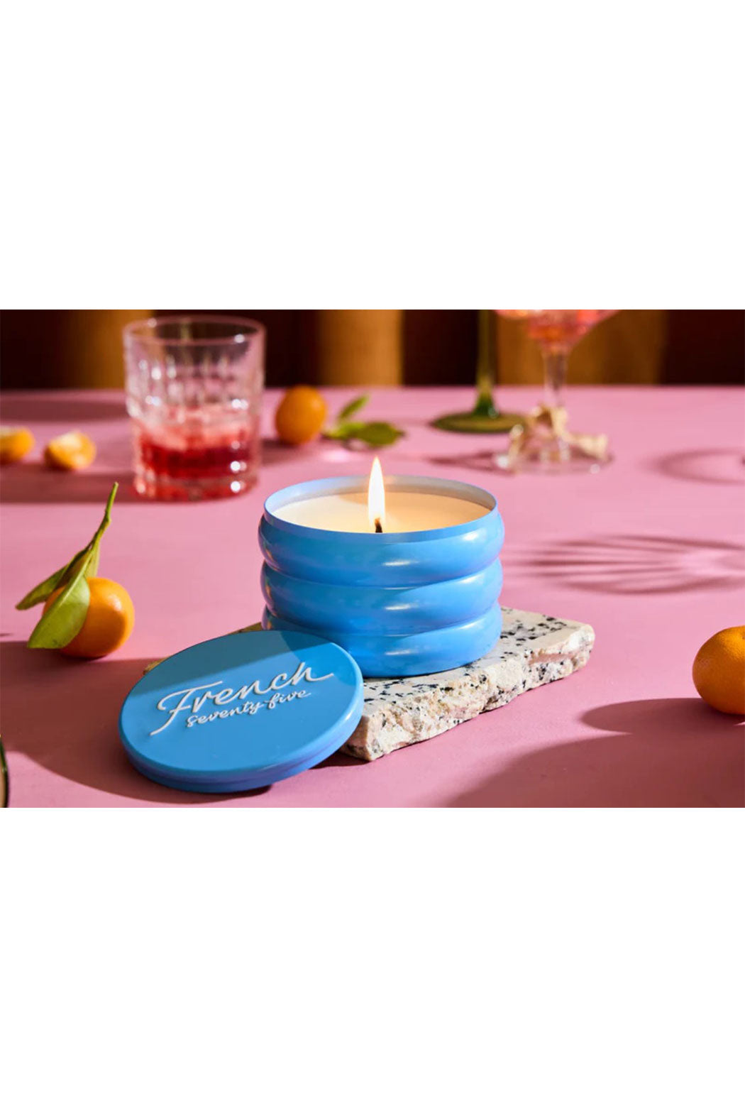 Sophisticated, lively, and nostalgically glamorous. Step into a world of timeless elegance with our French 75 candle, encased in a strikingly bright blue tin that echoes the cocktail's iconic charm. This candle pays homage to the classic allure of tuxedo jackets and the romantic mystique of a Casablanca club scene. It offers an effervescent fusion of sparkling wine and zesty lemon citrus, underpinned by the distinctive aroma of juniper.
