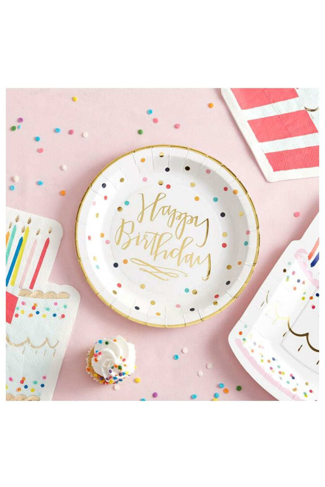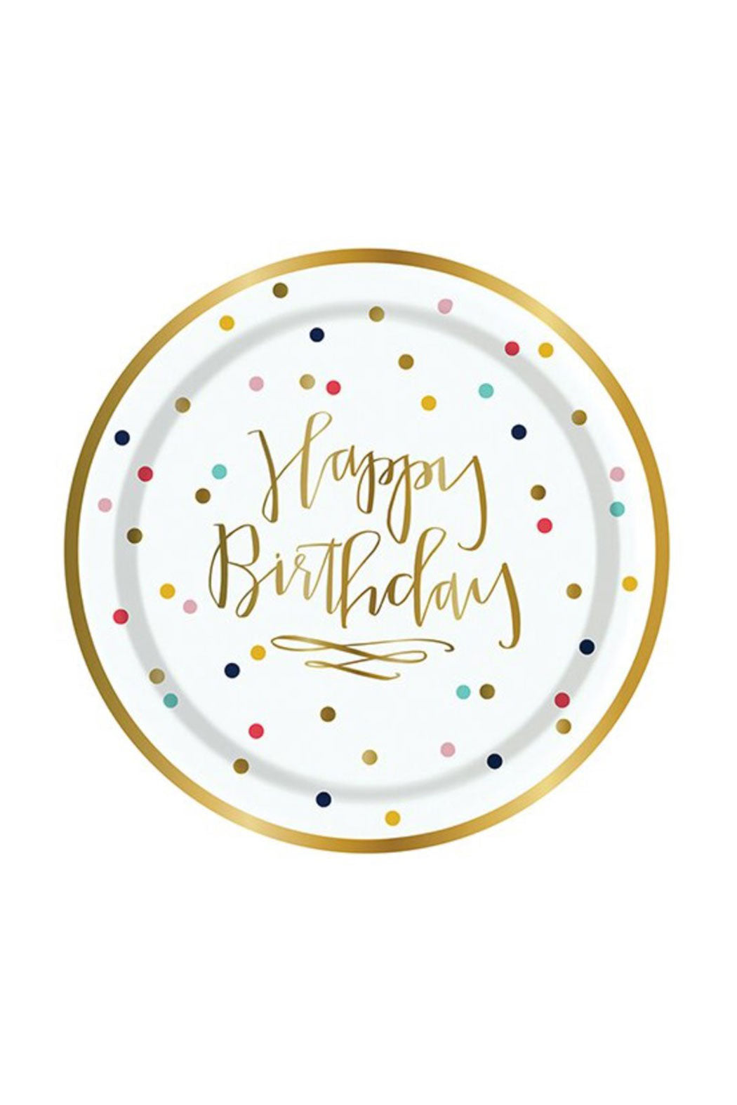 Polka dot pattern with the phrase "Happy Birthday" in gold lettering