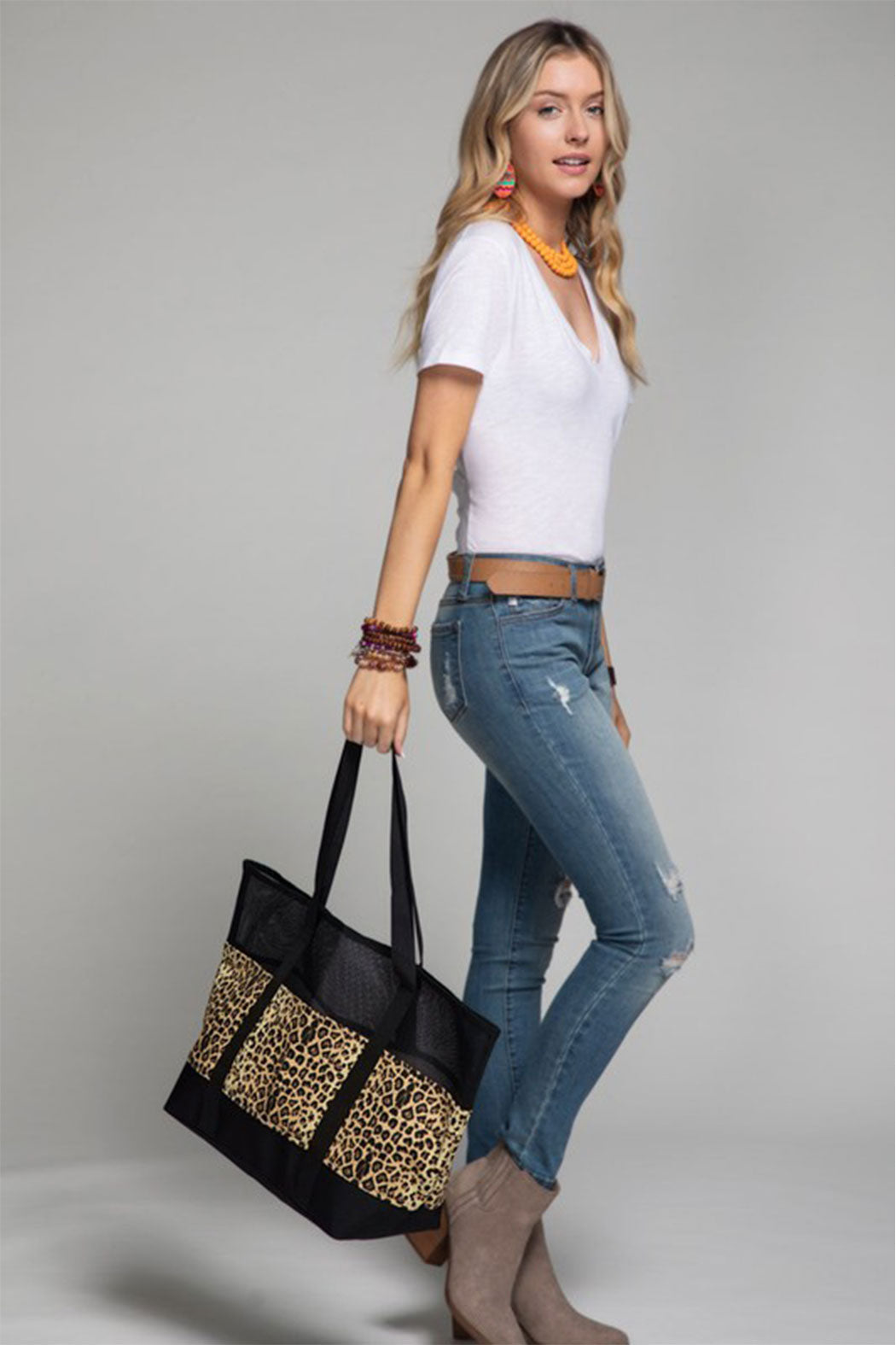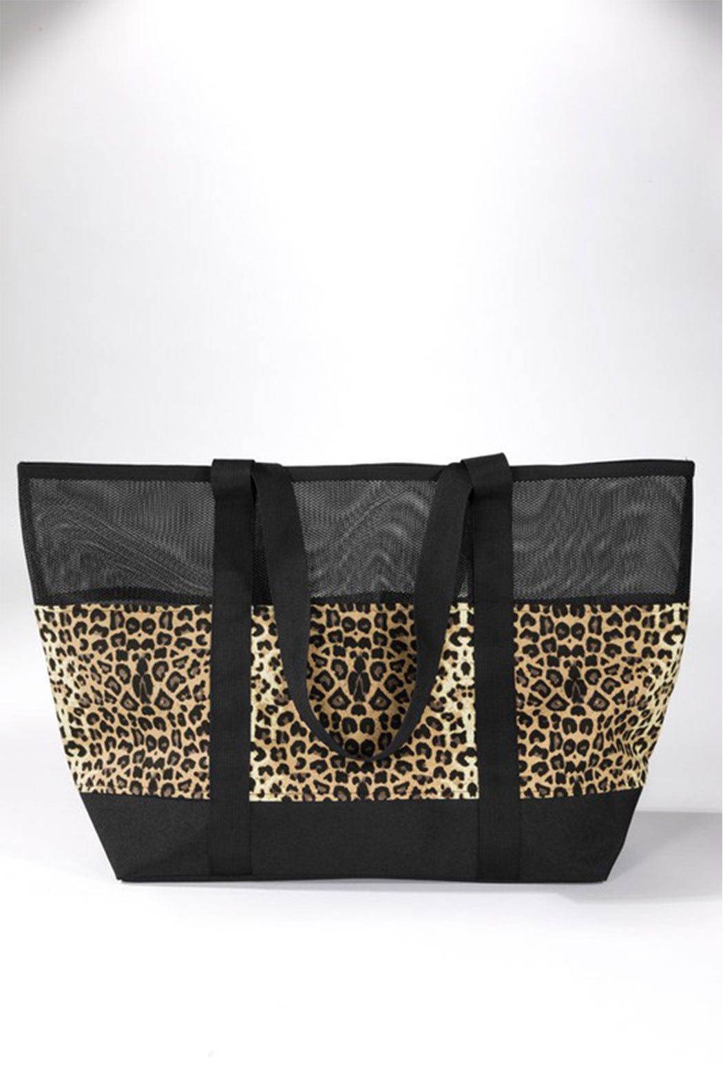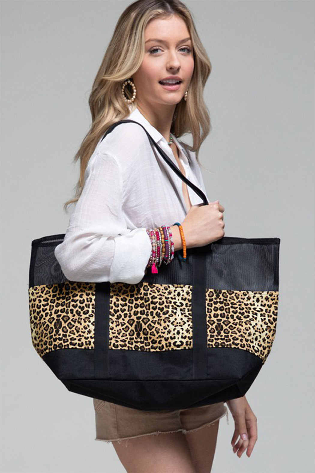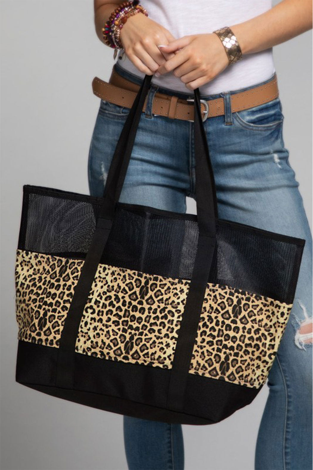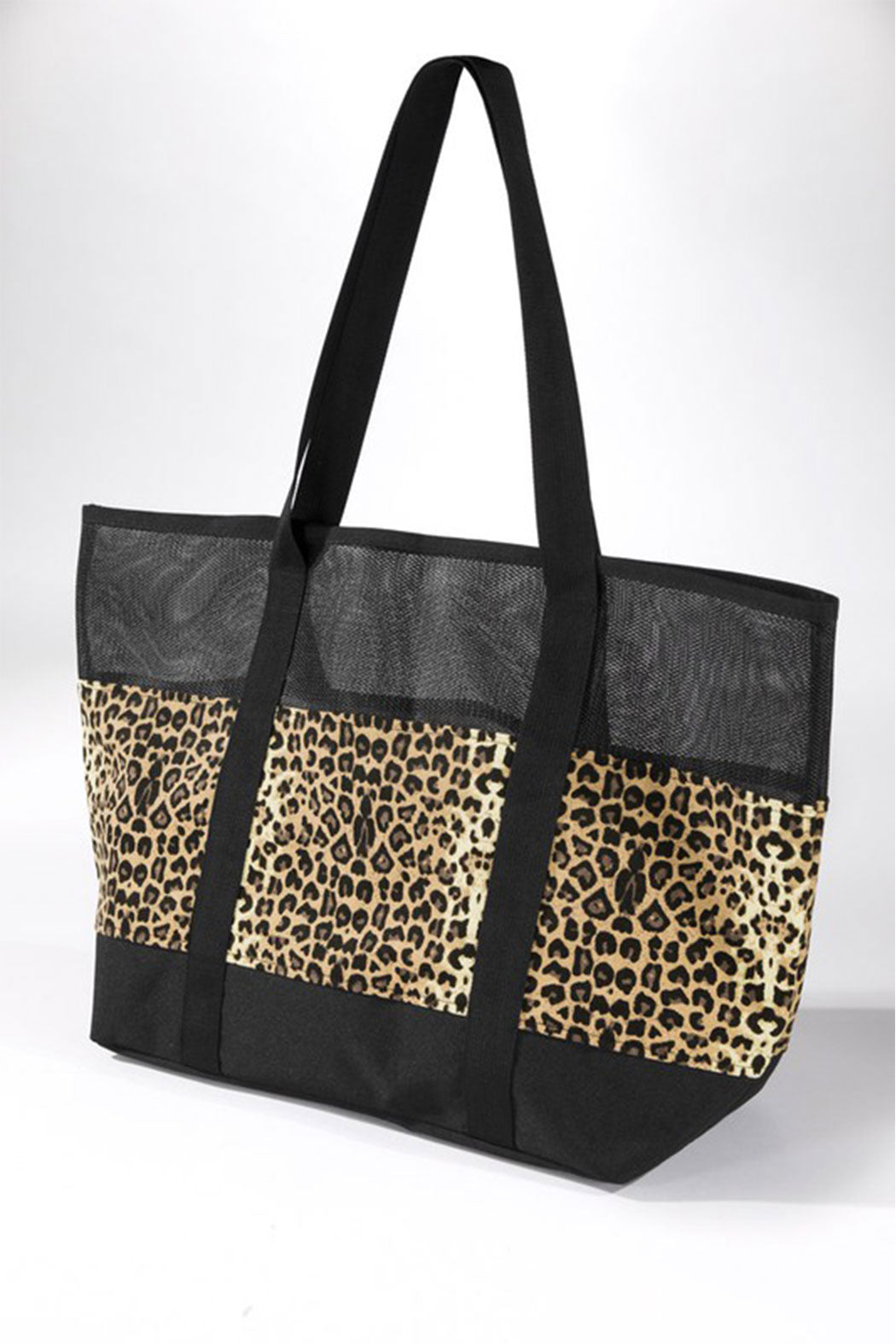 Trendy light mesh leopard print shoulder bag with velcro closure.