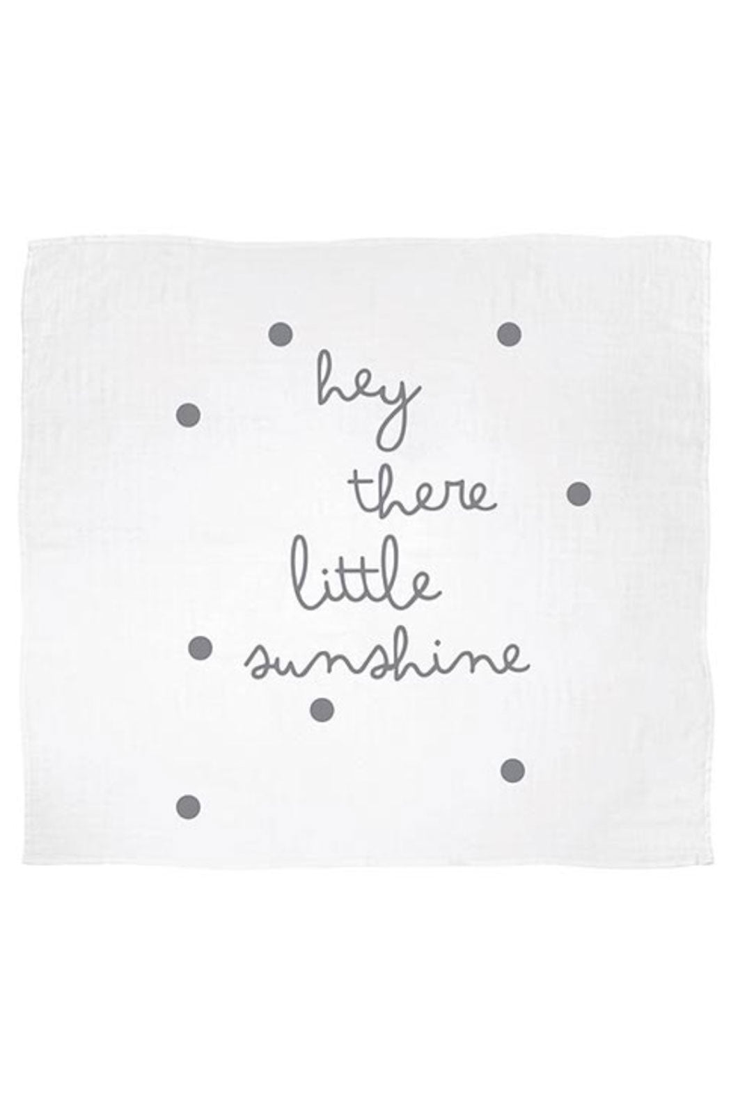 Wrap baby in words of wisdom and love; this snuggly soft swaddle blanket features the phrase 'Hey There Little Sunshine'.