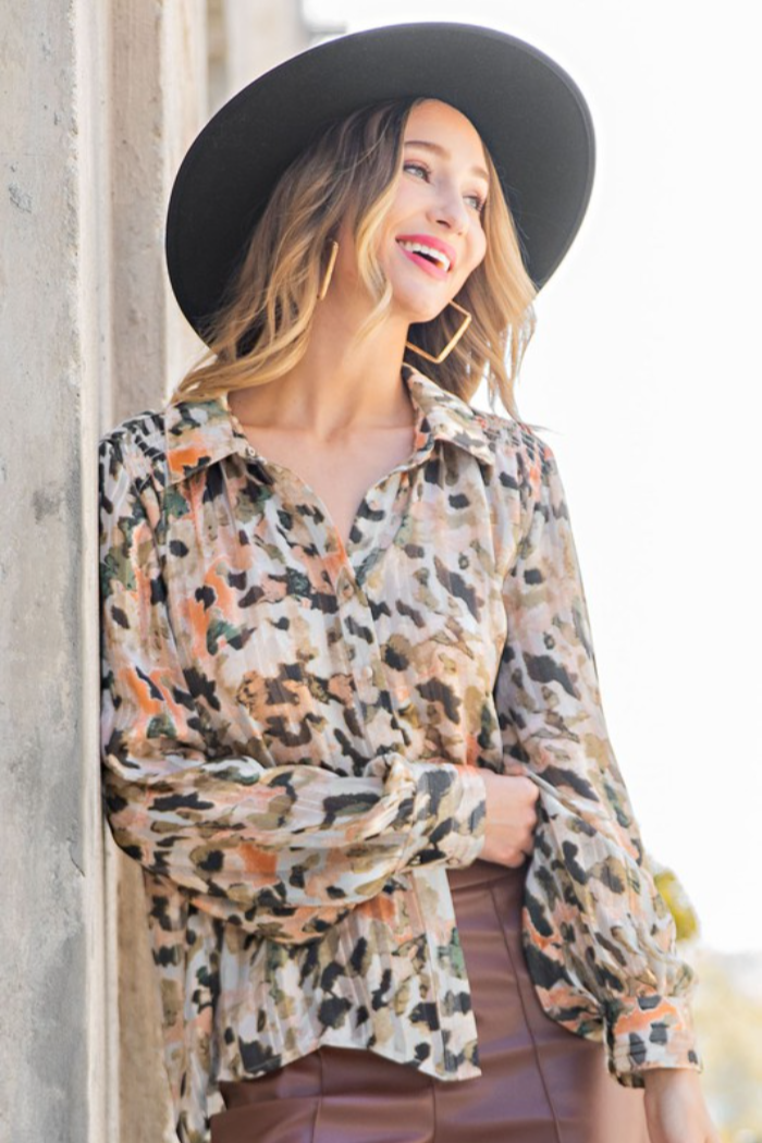 Water color printed top featuring button down front, collar, and button cuffs. Model is 5'8" and wearing a small.