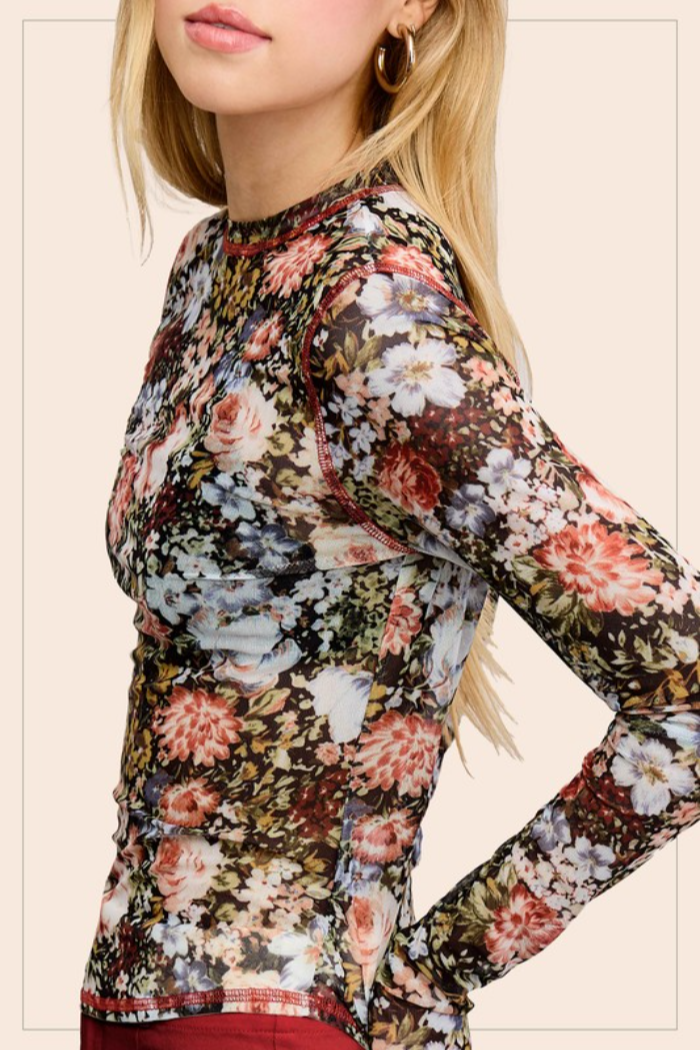 Designed for versatile layering, this semi-sheer mesh top features a delicate floral pattern, fitted long sleeves, and a classic crew neckline. With its stretchy fabrication and exposed stitching, it offers a lightweight, comfortable fit perfect for any season. Whether layered or worn on its own, this simple yet stylish top is a must-have for effortless looks.