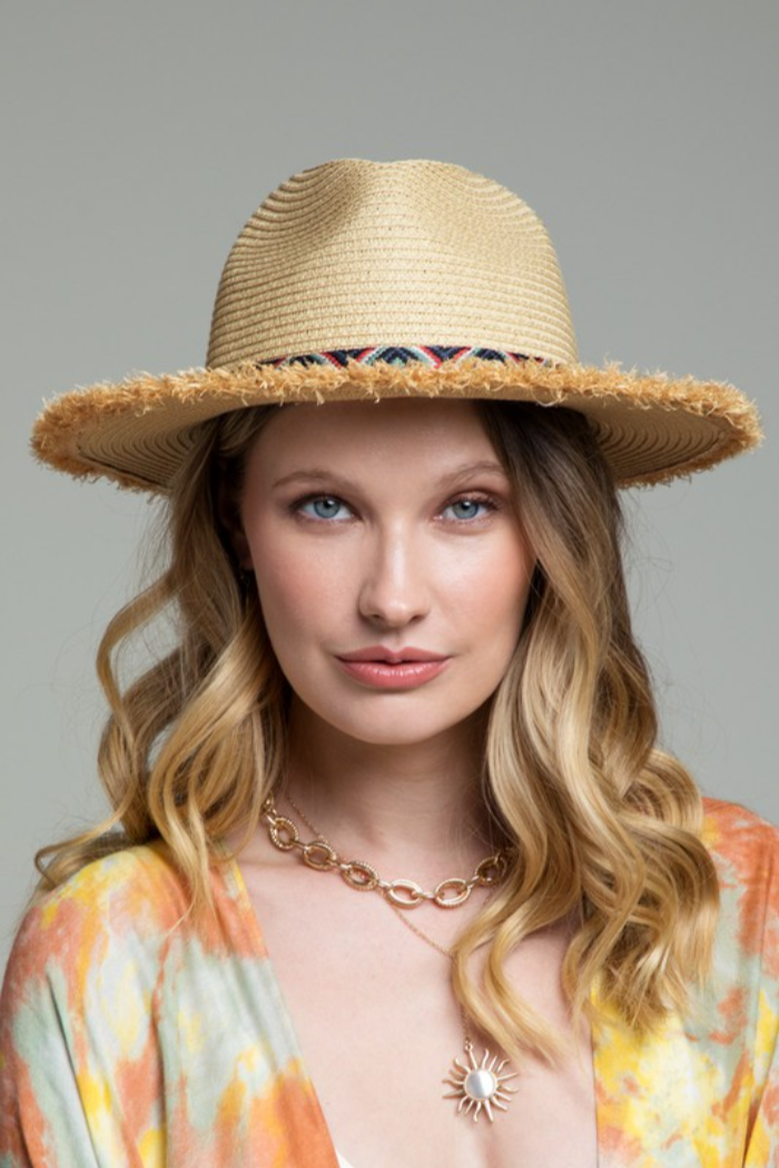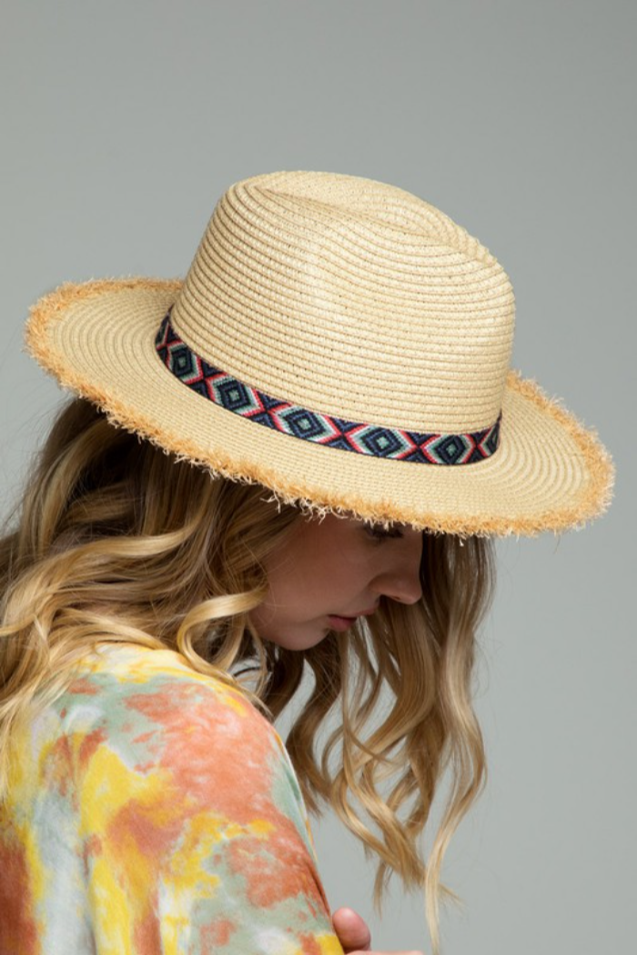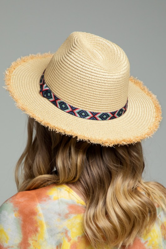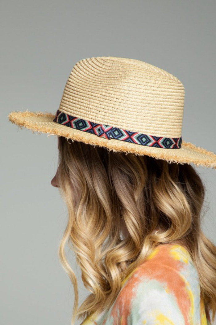 Ethnic trim tape with inner adjustable band frayed edge panama hat