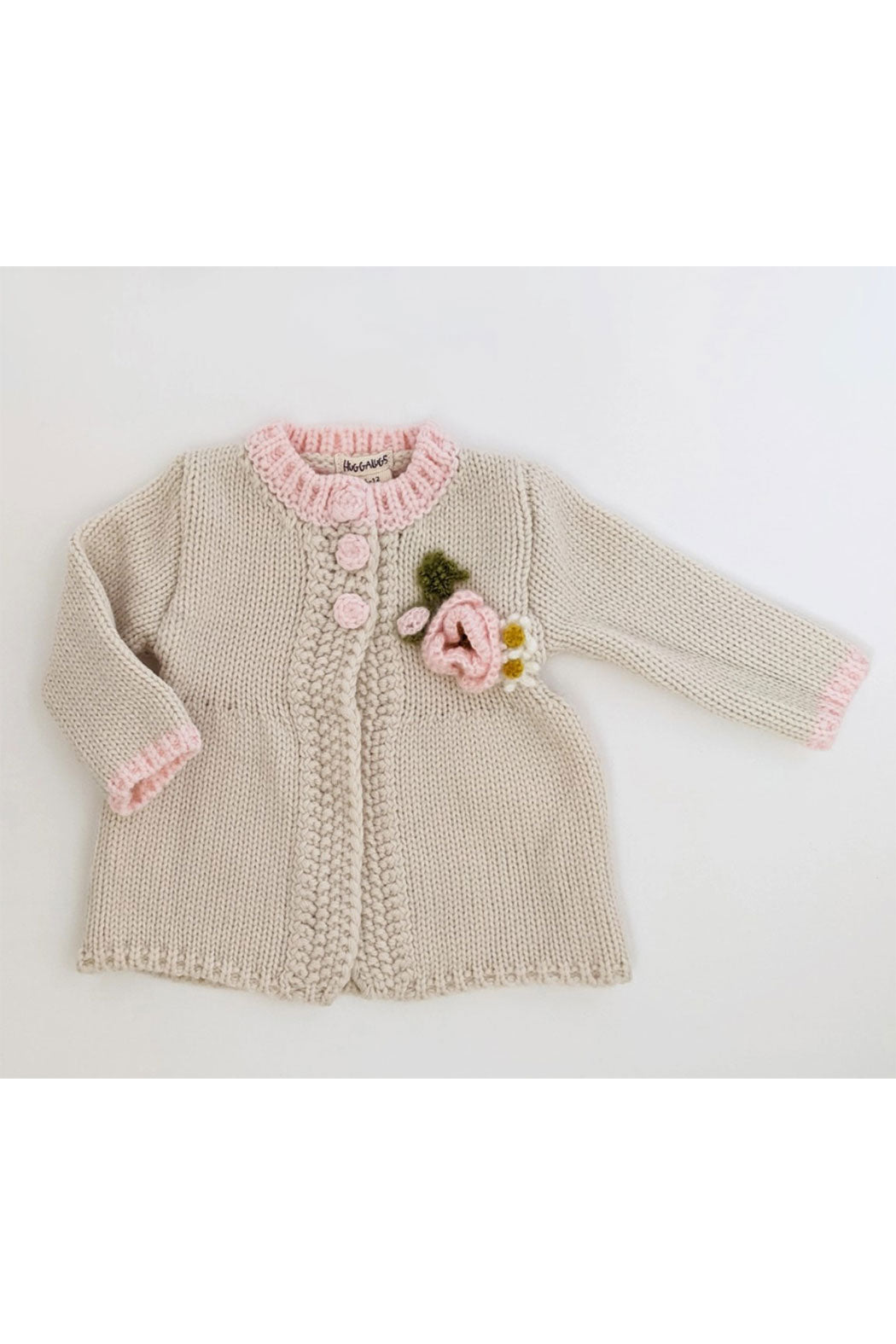 This stunning swing-style sweater is knit in natural hued yarn and embellished with beautiful mohair poppy blossoms. It has soft yarn button closures and is edged in matching light pink yarn.