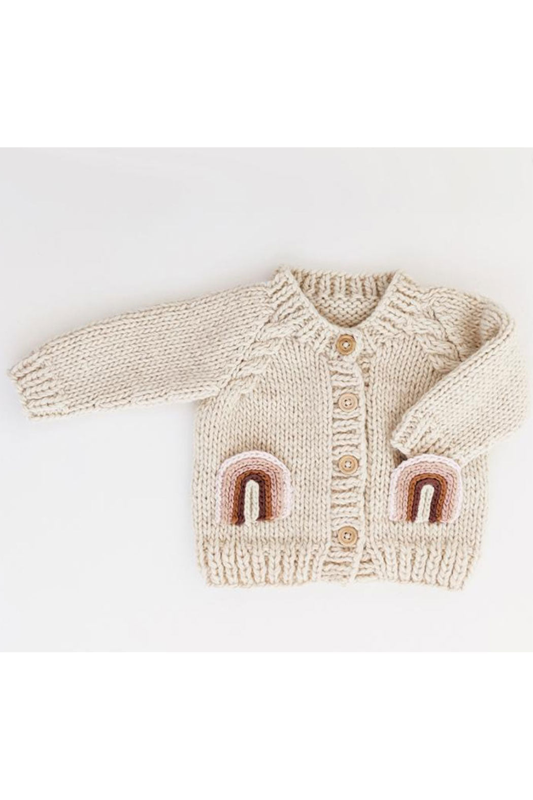Thick, soft sweater with mauve rainbow pockets, cable trim, raglan sleeves and wood buttons. Hand-knit in natural hued Icelandic yarn, it is cozy and warm. What a wonderful gift for any little person you know.