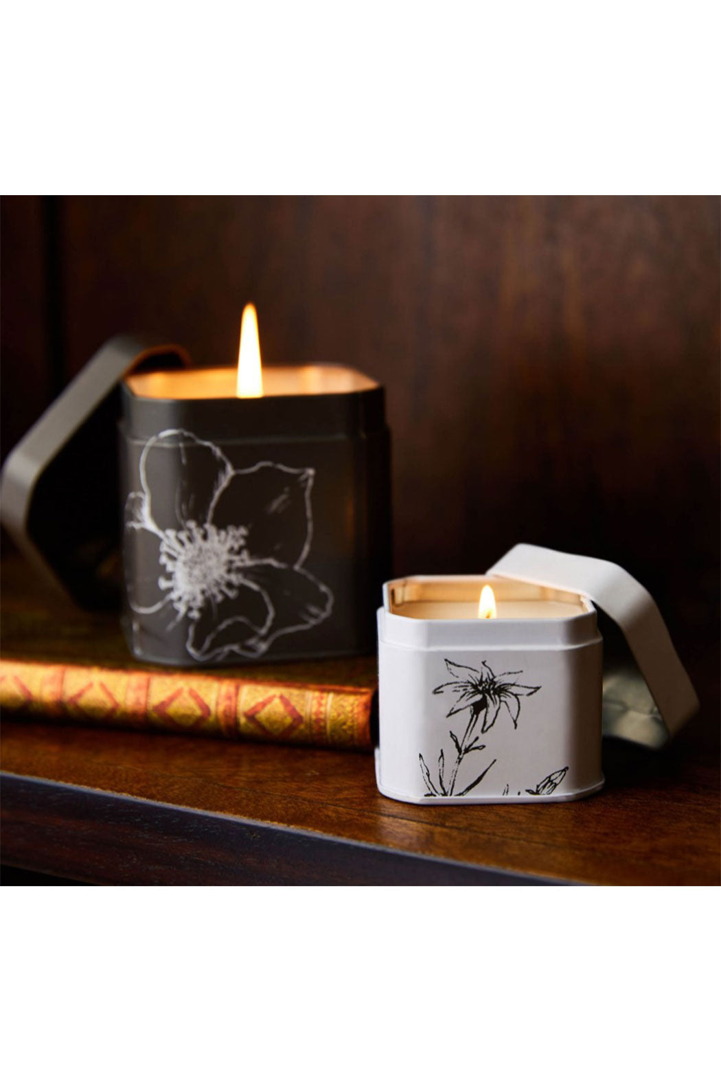 These fragrant candles in charcoal tins with white botanical sketches are hand poured with a coconut wax blend and finished with a cotton wick.
