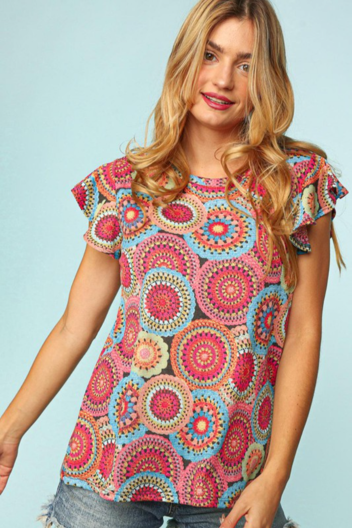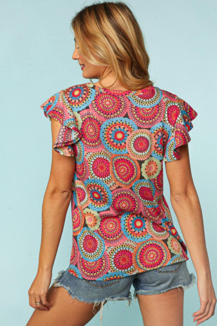 Round neck ruffle short sleeve crochet lace print top.