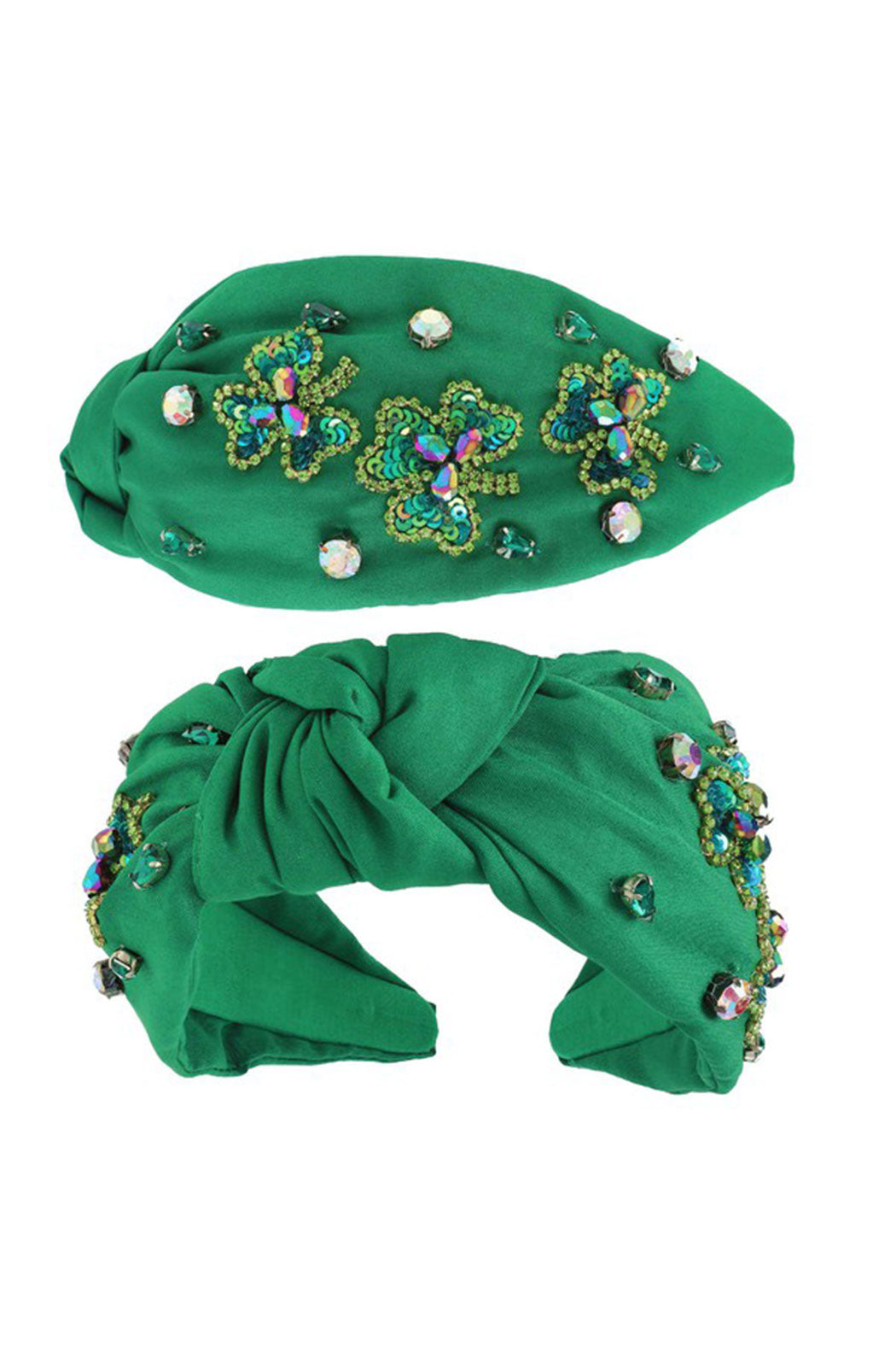 St. Patrick's Day shamrock gemstone sequin embellished top knotted headband. Height: 6.5" Width: 2.7"