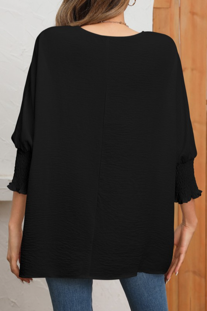 This relaxed fit blouse is figure flattering and lightweight. The blouse has a round neckline, loose 3/4-length sleeves with wide smocked cuffs.