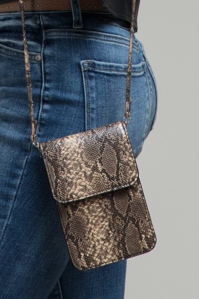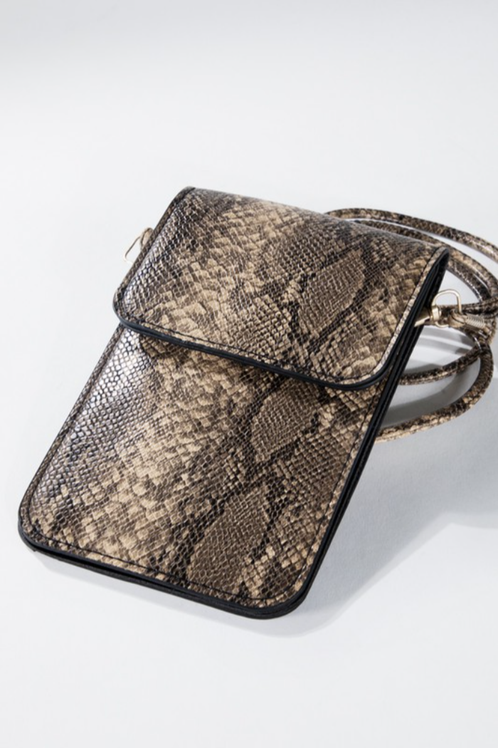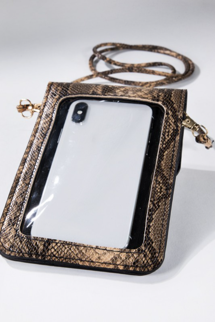 Trendy faux leather snake print cellphone cross-body with clear window bag