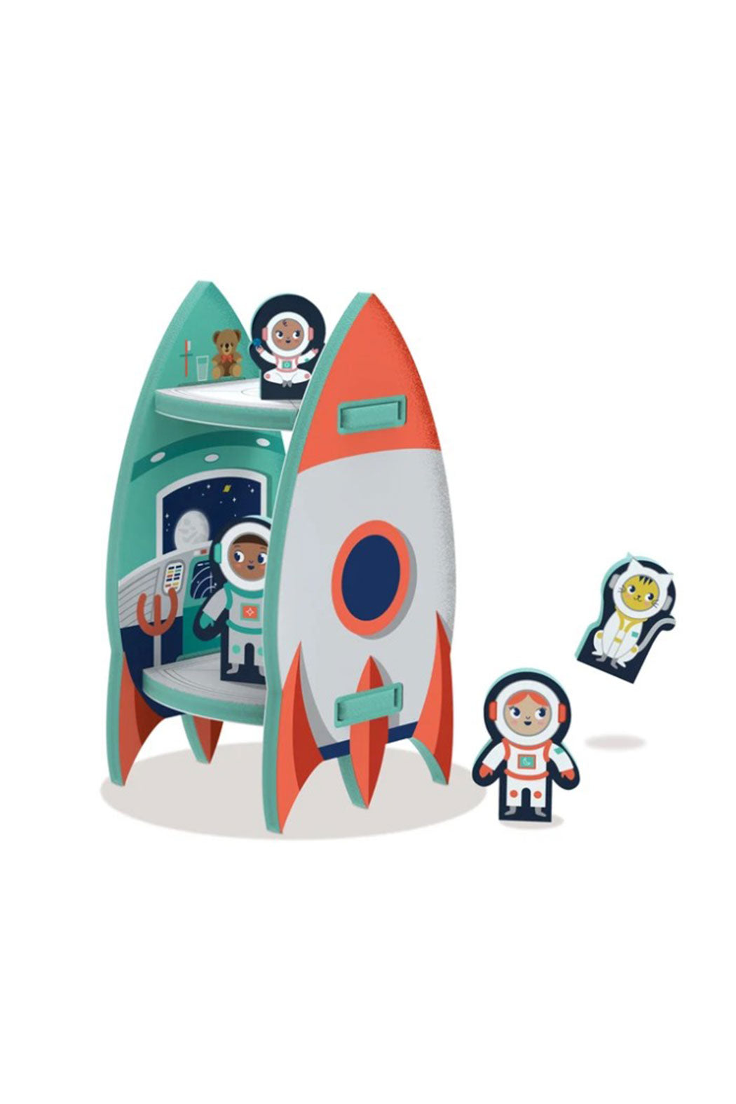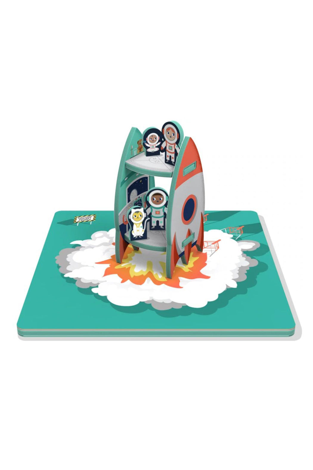 Imagine adventures with the Spaceship, astronauts, cat and launch pad scene