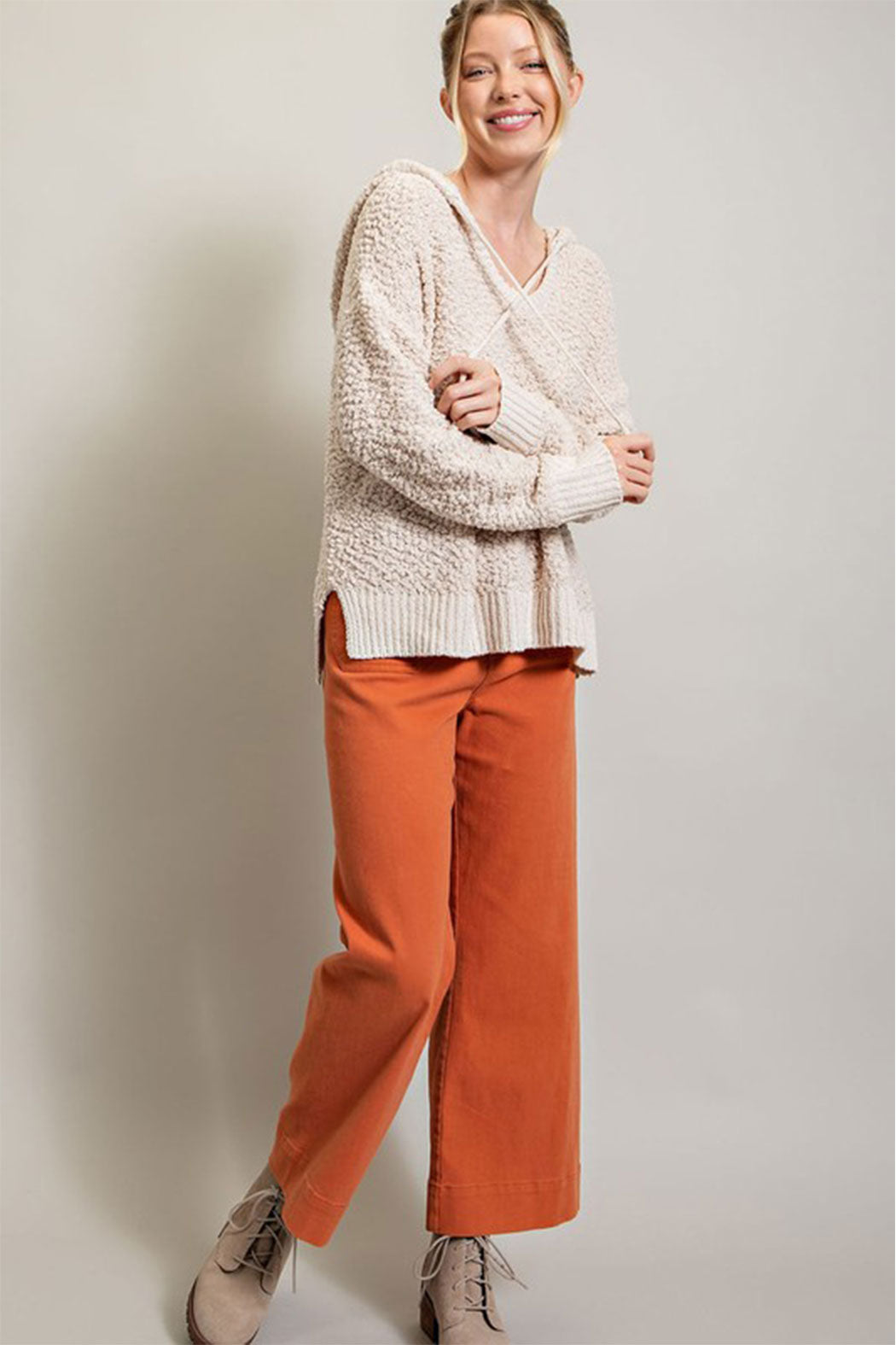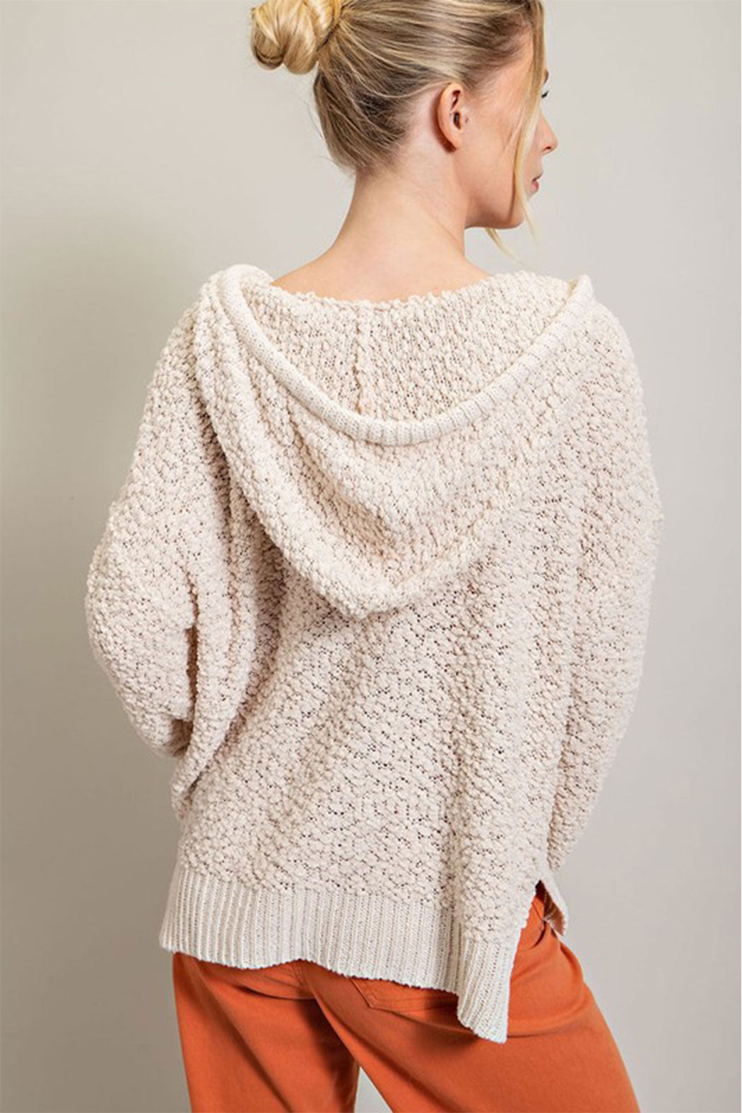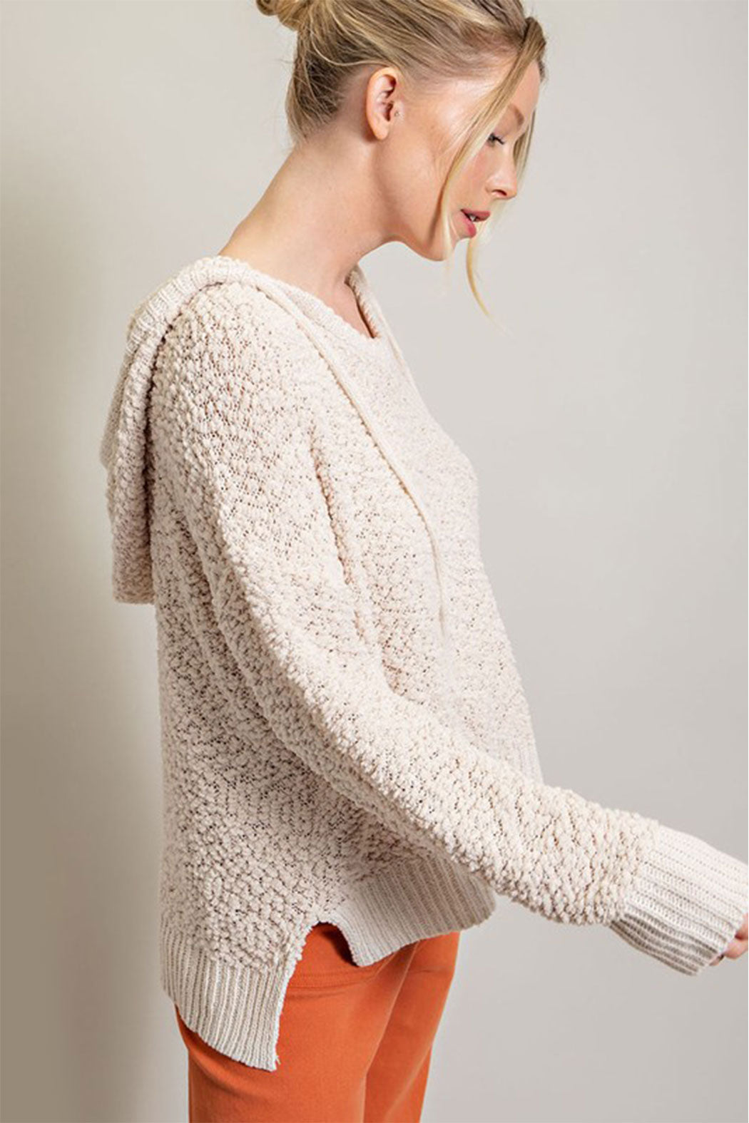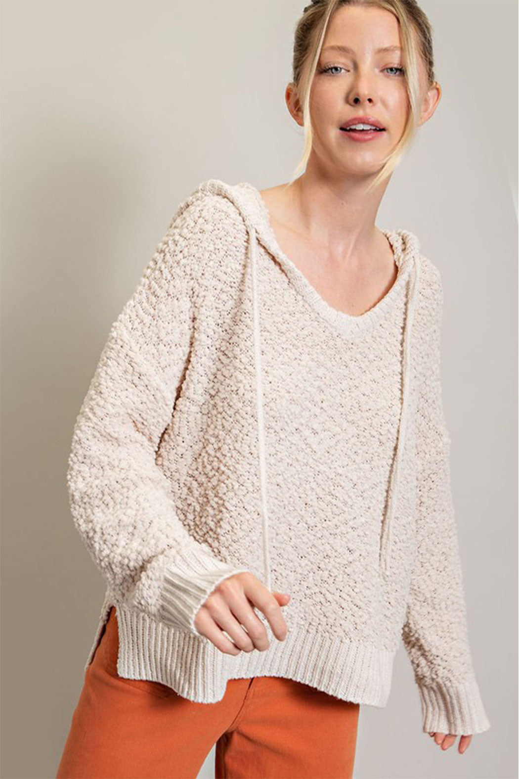 Textured knit sweater pullover featuring a scoop neckline with a front tie pull closure, two side slits, and a ribbed bottom band and cuffs. Model is 5'8" and is wearing small.