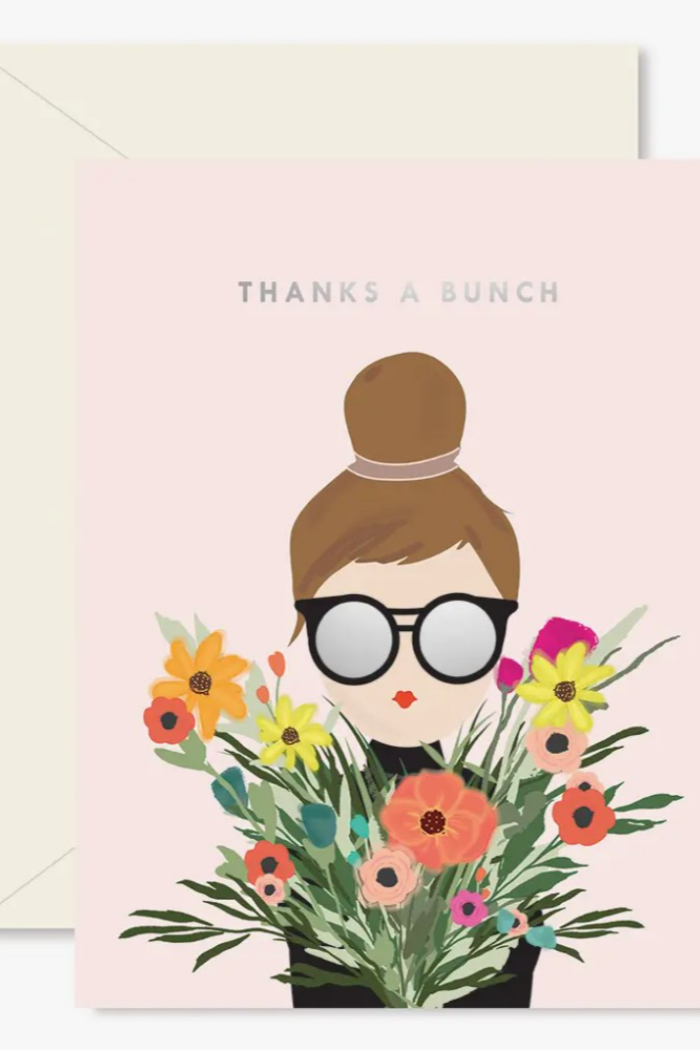 Thanks a bunch. Full-color 4.25" x 5.5" folded cards. With silver foil. Blank interior.