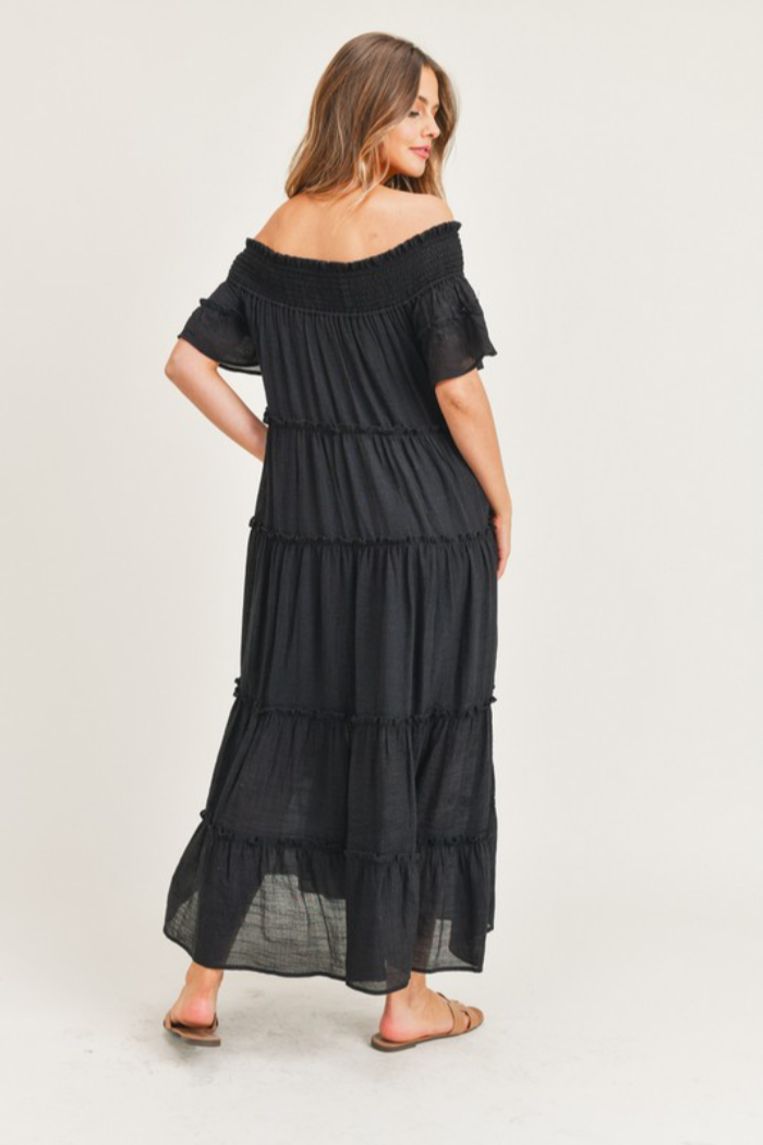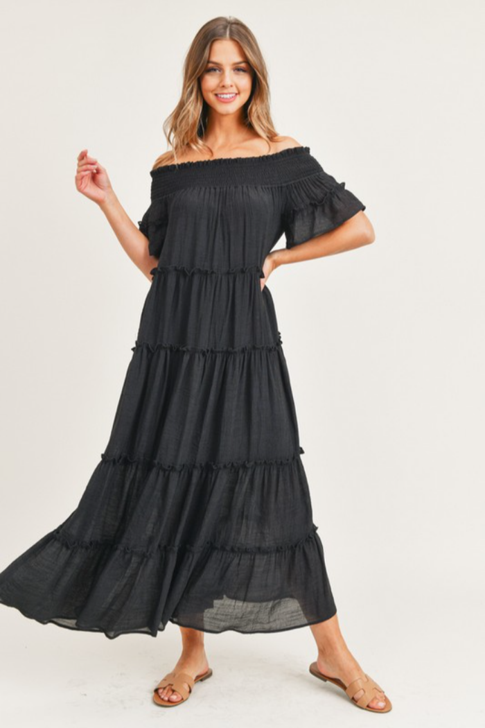 Solid maxi dress with an elasticized off shoulder neckline, short bell sleeves, and tiered layers.