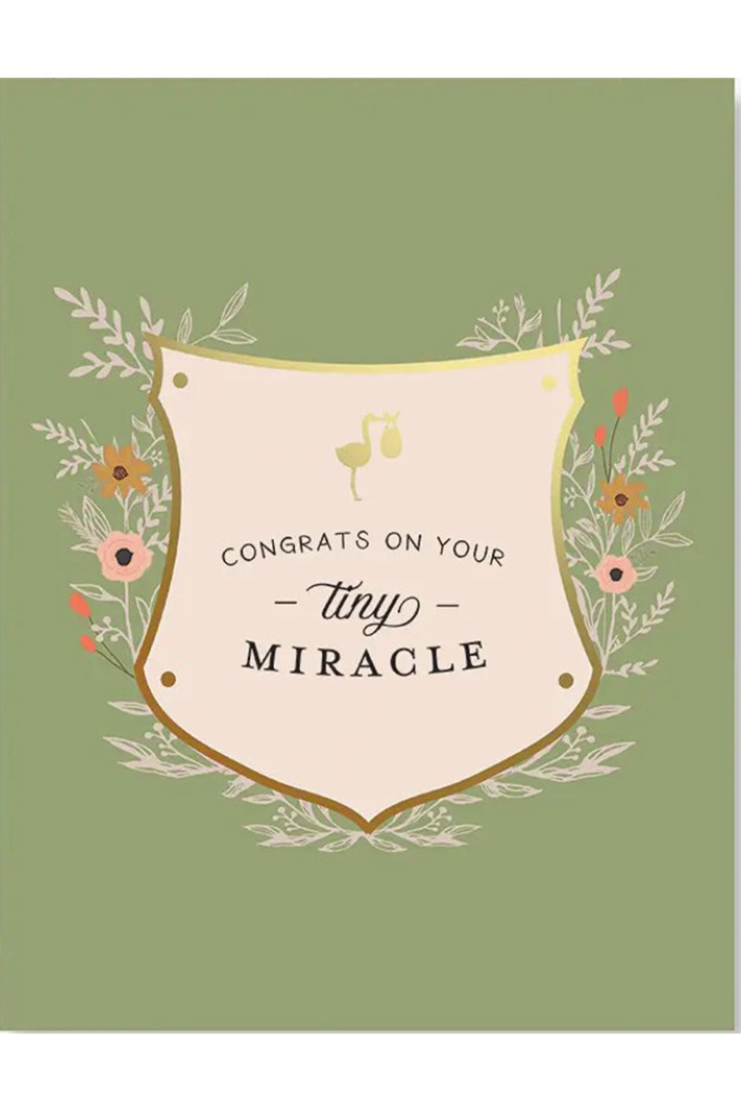 Congrats on your tiny miracle. With gold foil. 4.25" x 5.5". Full - color 4.25" x 5.5" folded cards. Blank interior.