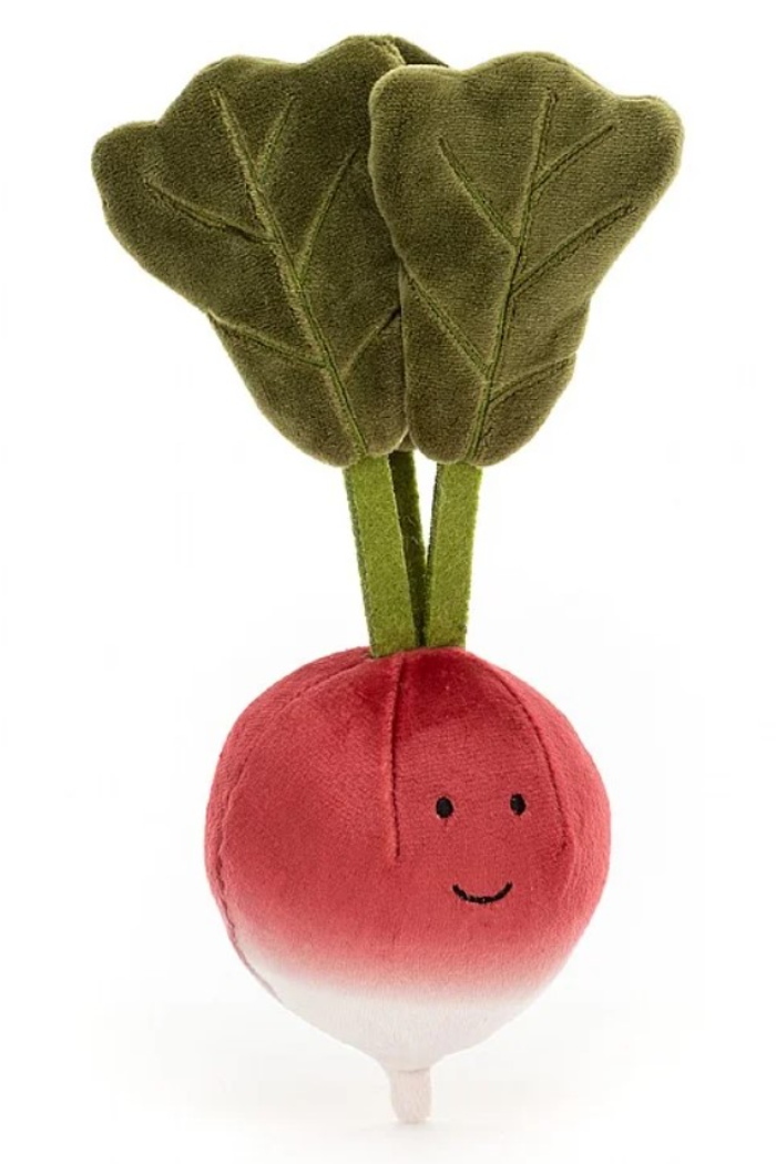 More stretchy than crunchy, Vivacious Radish is a most refreshing friend! Perky in pink-white ombre fur, with a plume of stitchy green velour leaves, this affable vegetable pops up to say hello! A kitchen mascot or goofy gift with the happiest smile in the salad drawer!